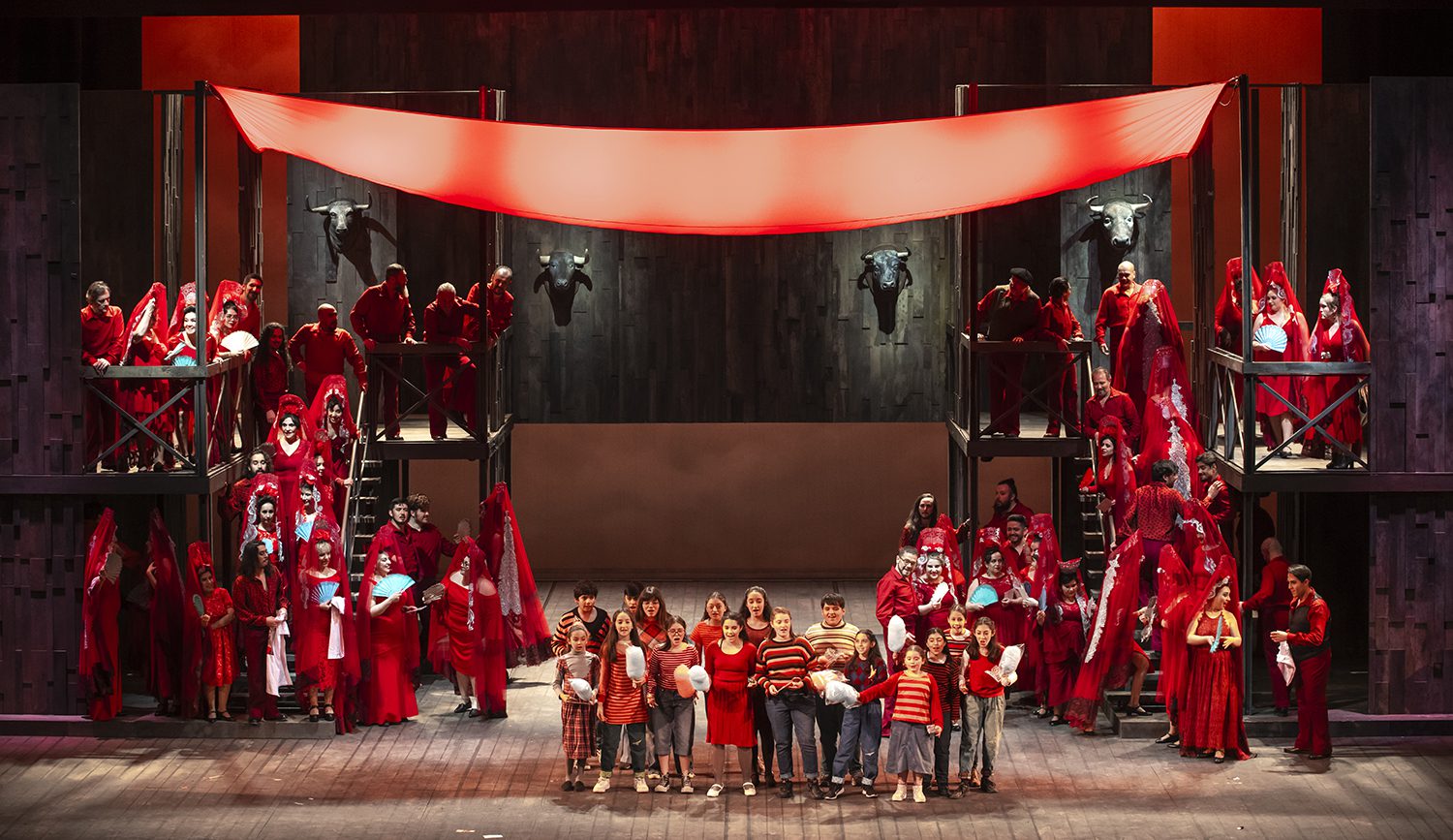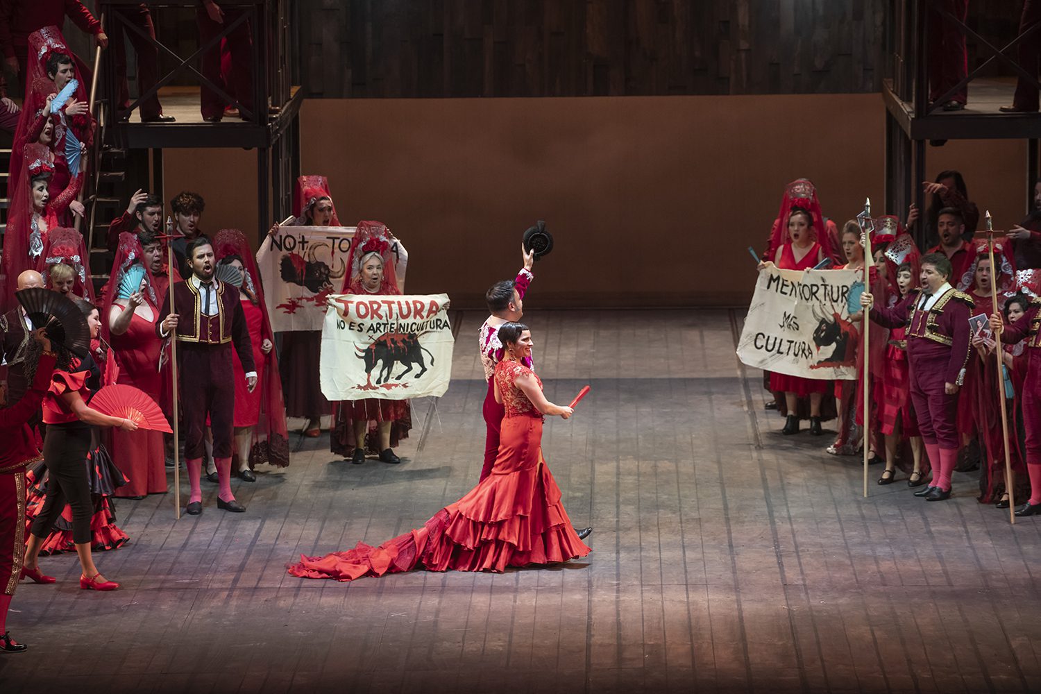 Ya mencionamos el brillante acto final, en las afueras de la Plaza de Toros, de envolvente rojo, resaltado por un lienzo, que cruza el escenario sobre todos los intérpretes, el que incluyó activistas, en contra de las corridas de toros.