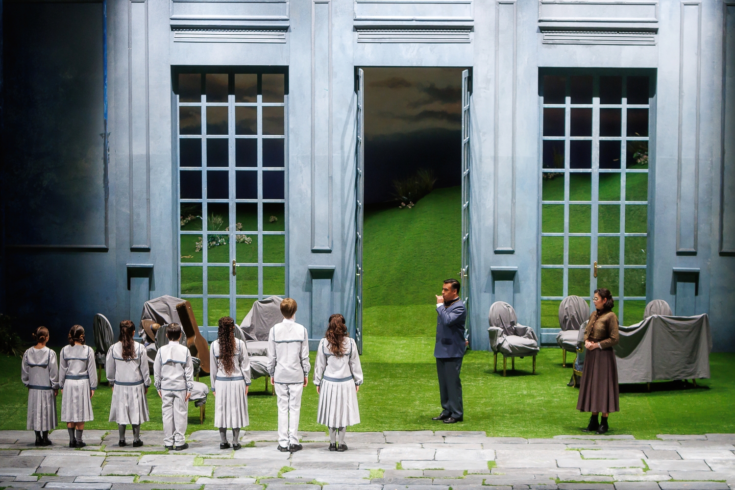 El capitán von Trapp (Patricio Sabaté) presenta sus hijos a María (Camila Gugguana), en los extremos Frau Schmidt (Paola Rodríguez) y el Mayordomo (Gonzalo Araya) segundo elenco foto Alberto Díaz