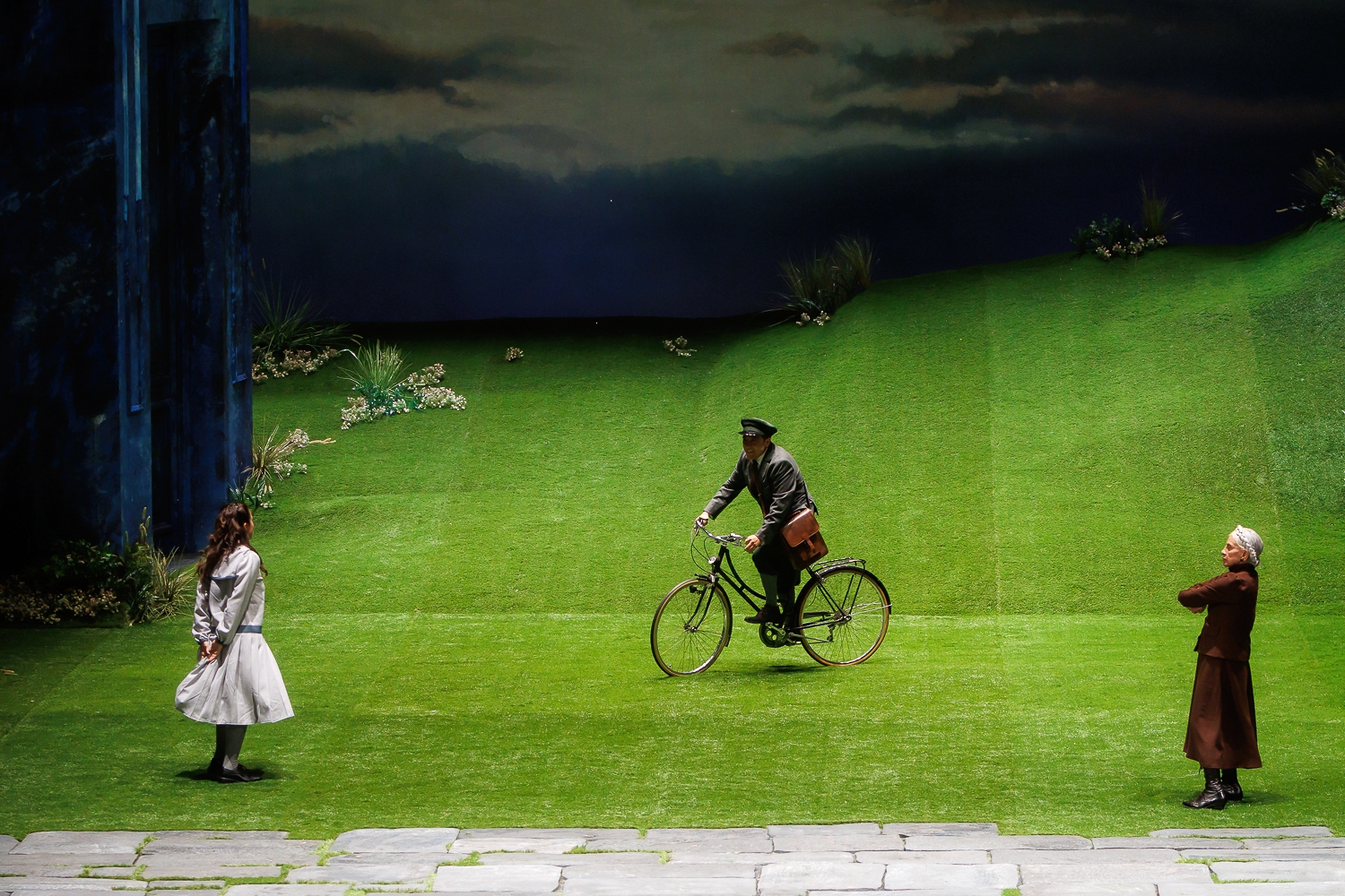 La hija mayor del capitán von Trapp se encuentra con su enamorado vigilados por Frau Schmidt (Gabu Hernández)  primer elenco foto Alberto Díaz
