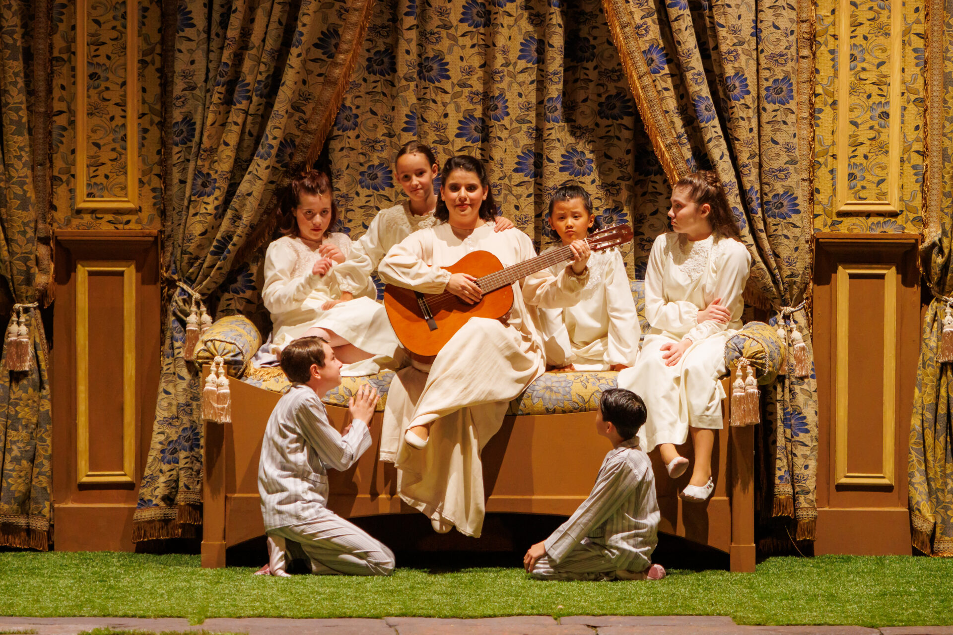 María (Camila Guggiana) canta con los niños von Trapp calmándolos en medio de una tormenta foto Alberto Díaz