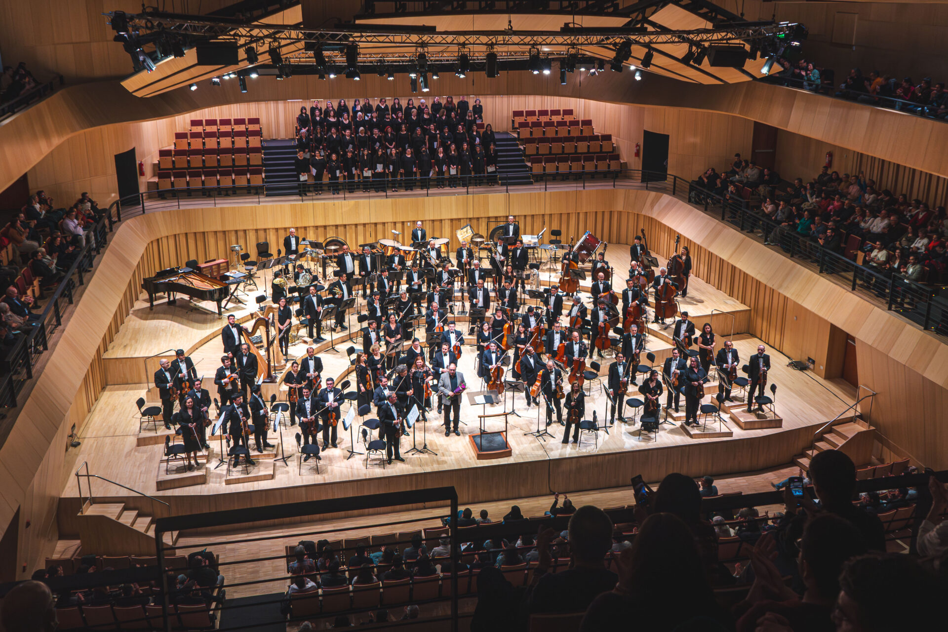 La Sinfónica, los Coros femeninos (poco iluminados) el director Juan Pablo Villarroel agradecen los aplausos. foto ceac