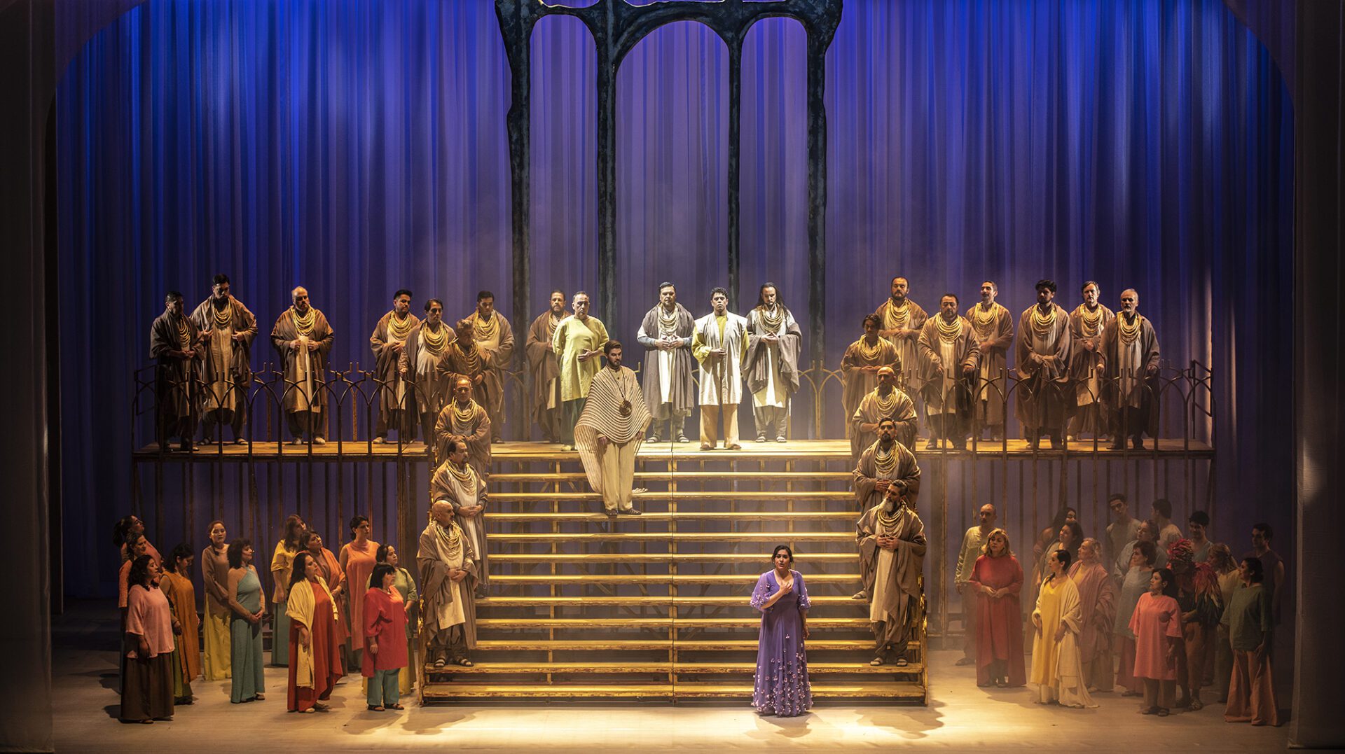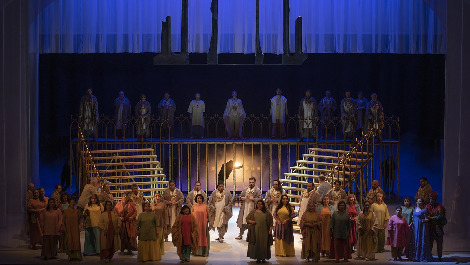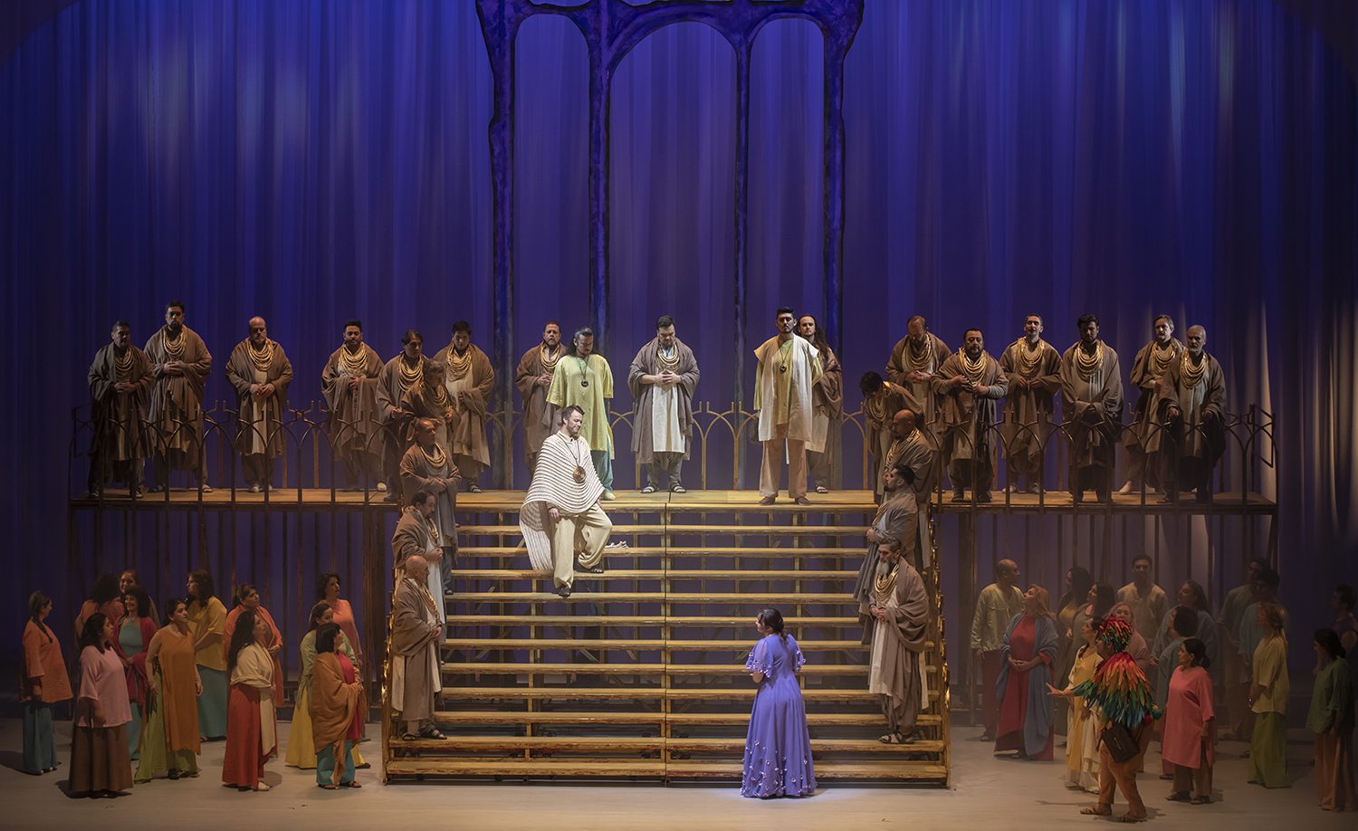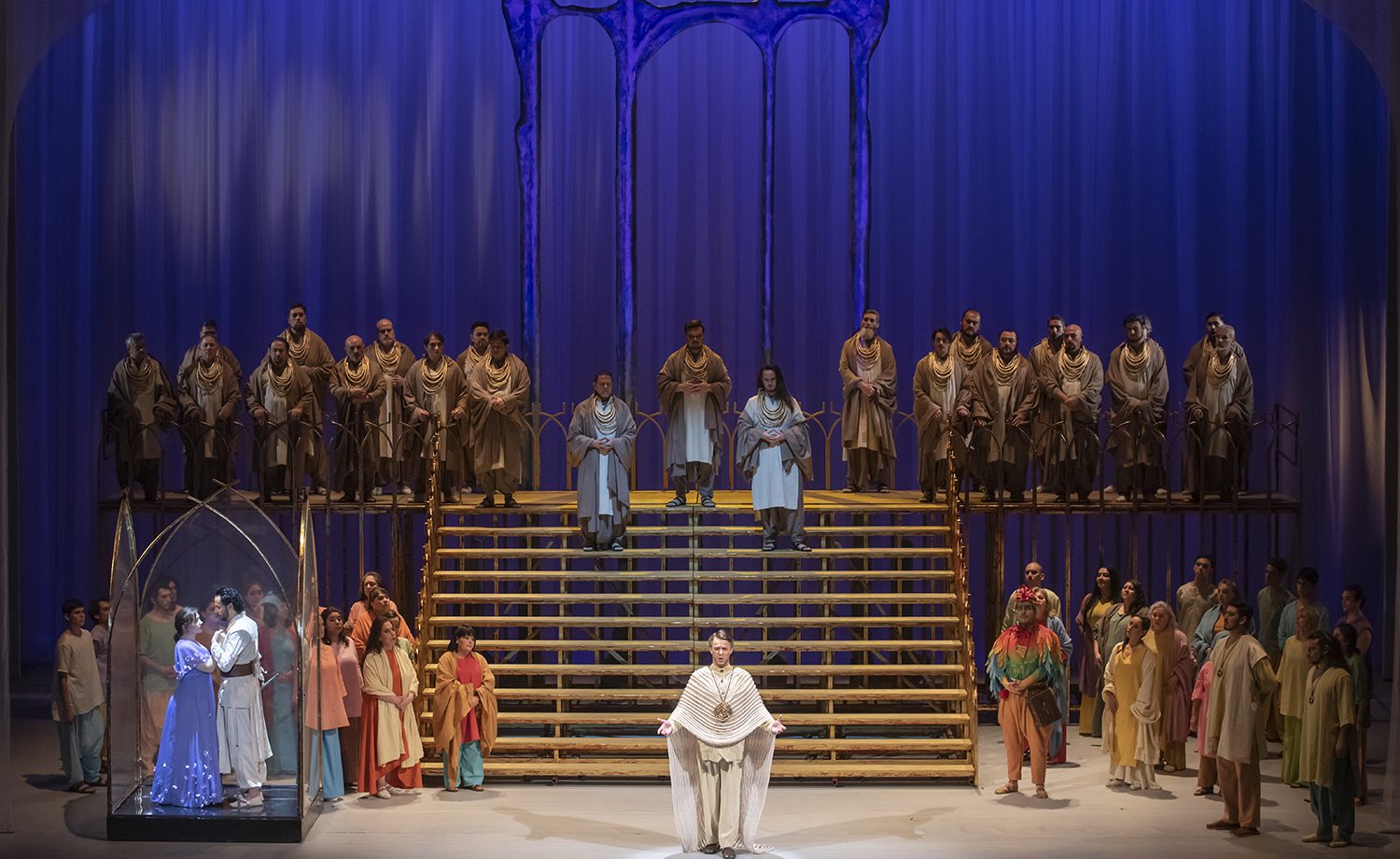 Escena en el templo, Pamina (Annya Pinto), Sarastro (Taras Berezhansky) y Sacerdotes. foto Patricio Cortés