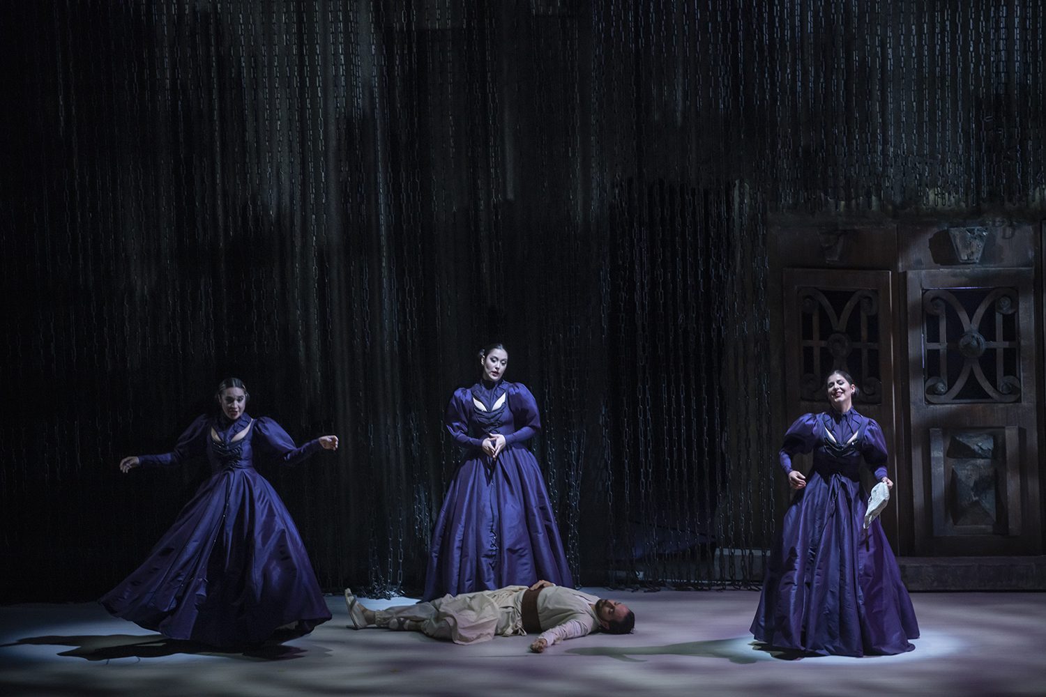 Las Tres Damas (Vanessa Rojas, Marcela González y Francisca Muñoz) contemplan al desvanecido Príncipe Tamino (Brayan Avila), foto Patricio Cortés