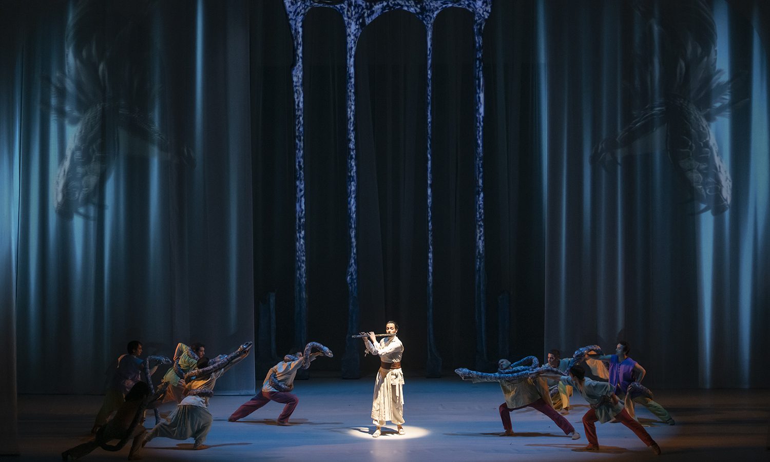 El Príncipe Tamino (Brayan Avila) encanta con su flauta a los animales foto Patricio Cortés