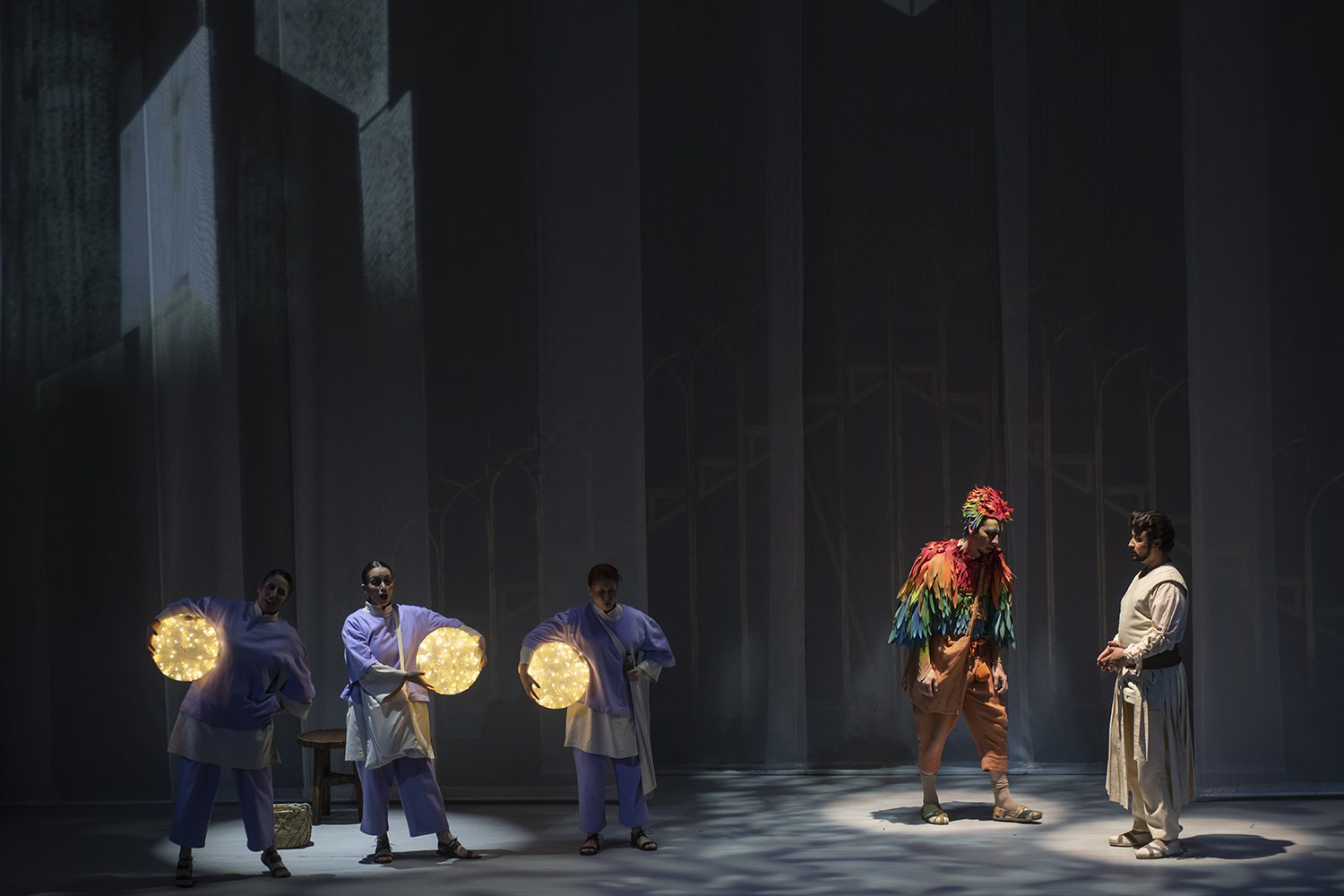 Los Tres Genios (Javiera Barrios, Nicole Galleguillos y Pilar Garrido), con Papageno (Alexandr Miminoshvili) y Tamino (Dmitri Ivanchey) foto Patricio Cortés