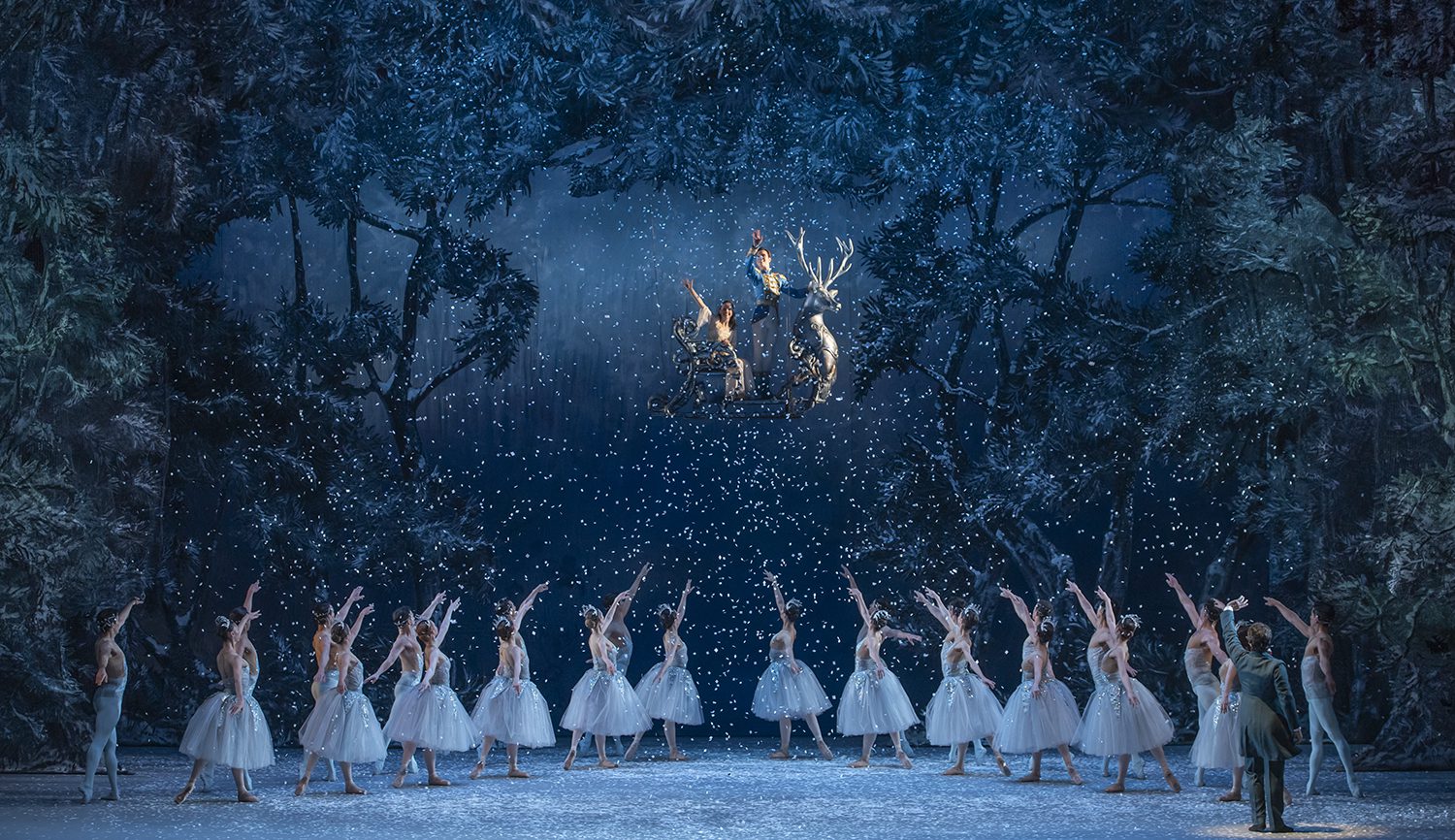 La mágica escena del final del primer acto, Clara y Cascanueces, abandonan en trineo, el Reino de los Copos de Nieve. foto Patricio Melo