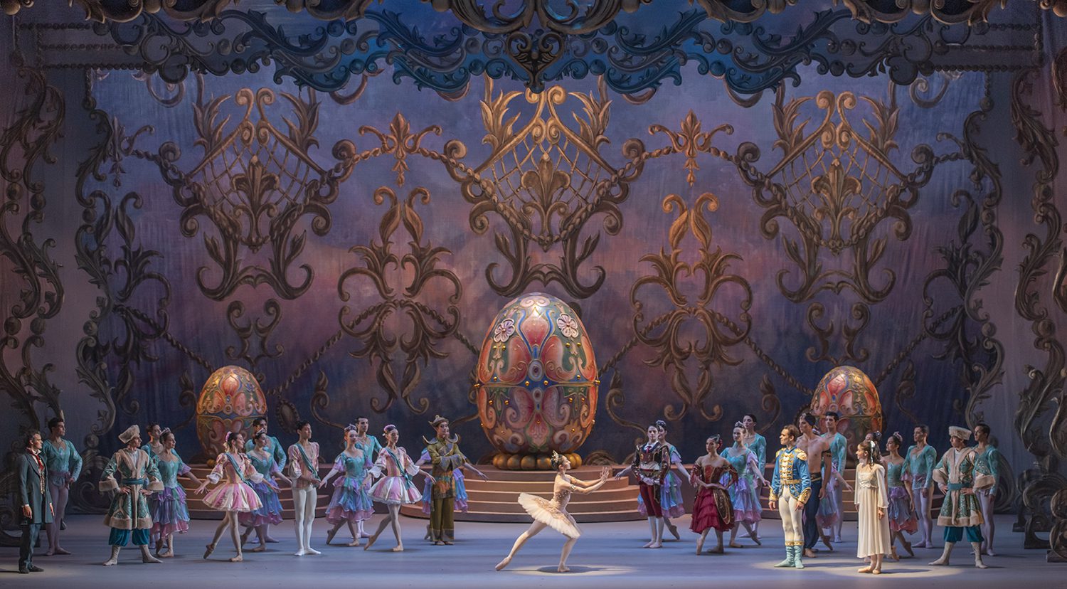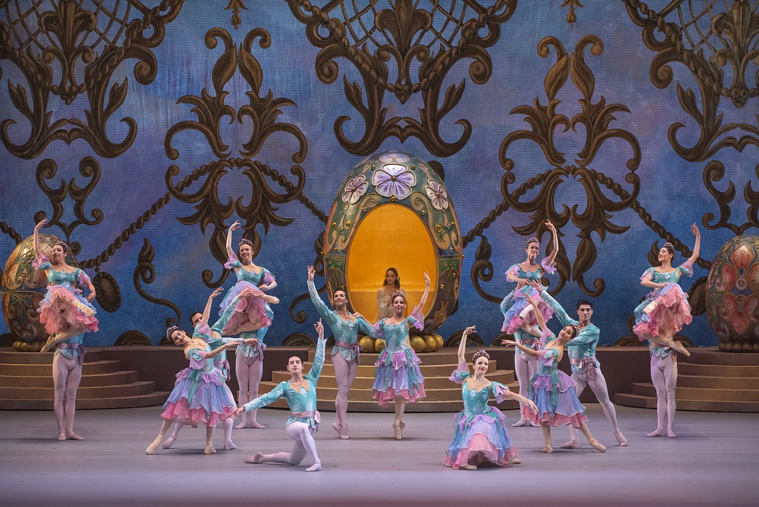 Drosselmeyer, a la izquierda, La Reina de los confites, al centro, saludando a Cascanueces y Clara, junto a todos los personajes del Reino de los confites, hacia el final del ballet. (elenco 1) foto Patricio Melo