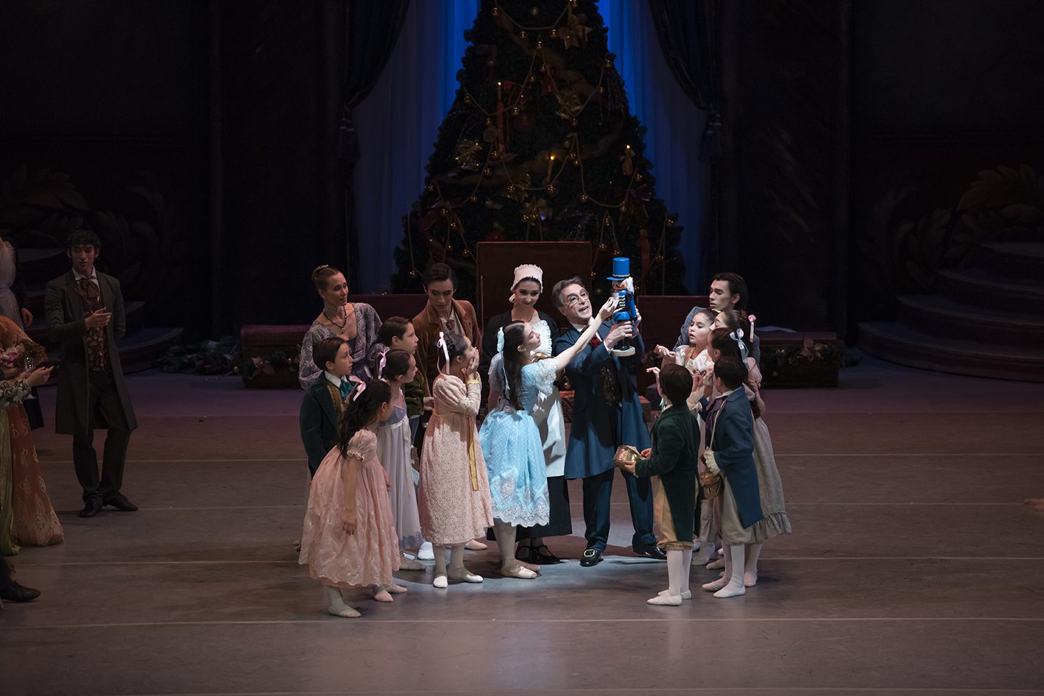 Drosselmeyer (Pablo Aharonian) y niños en la fiesta. foto Patricio Cortés