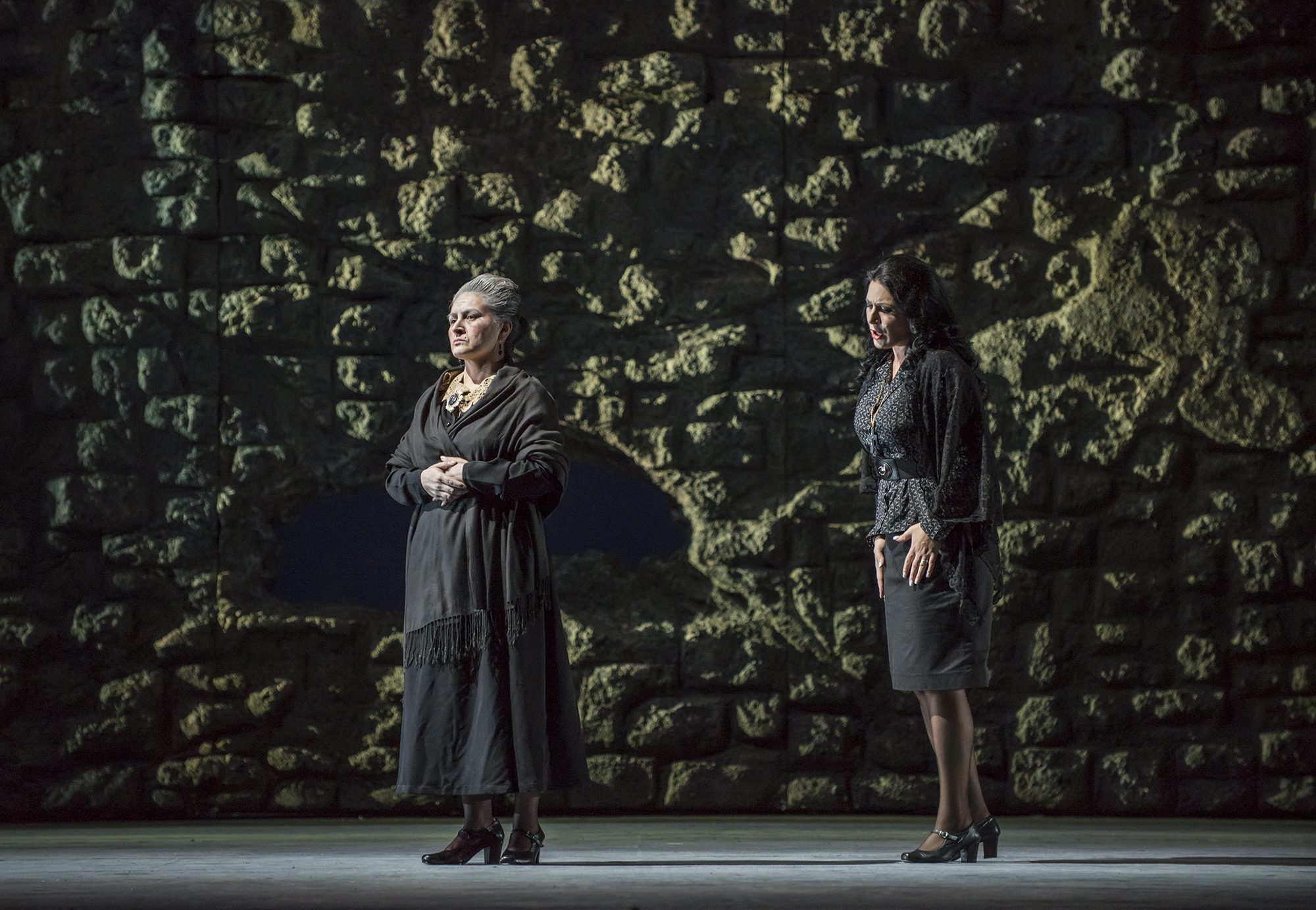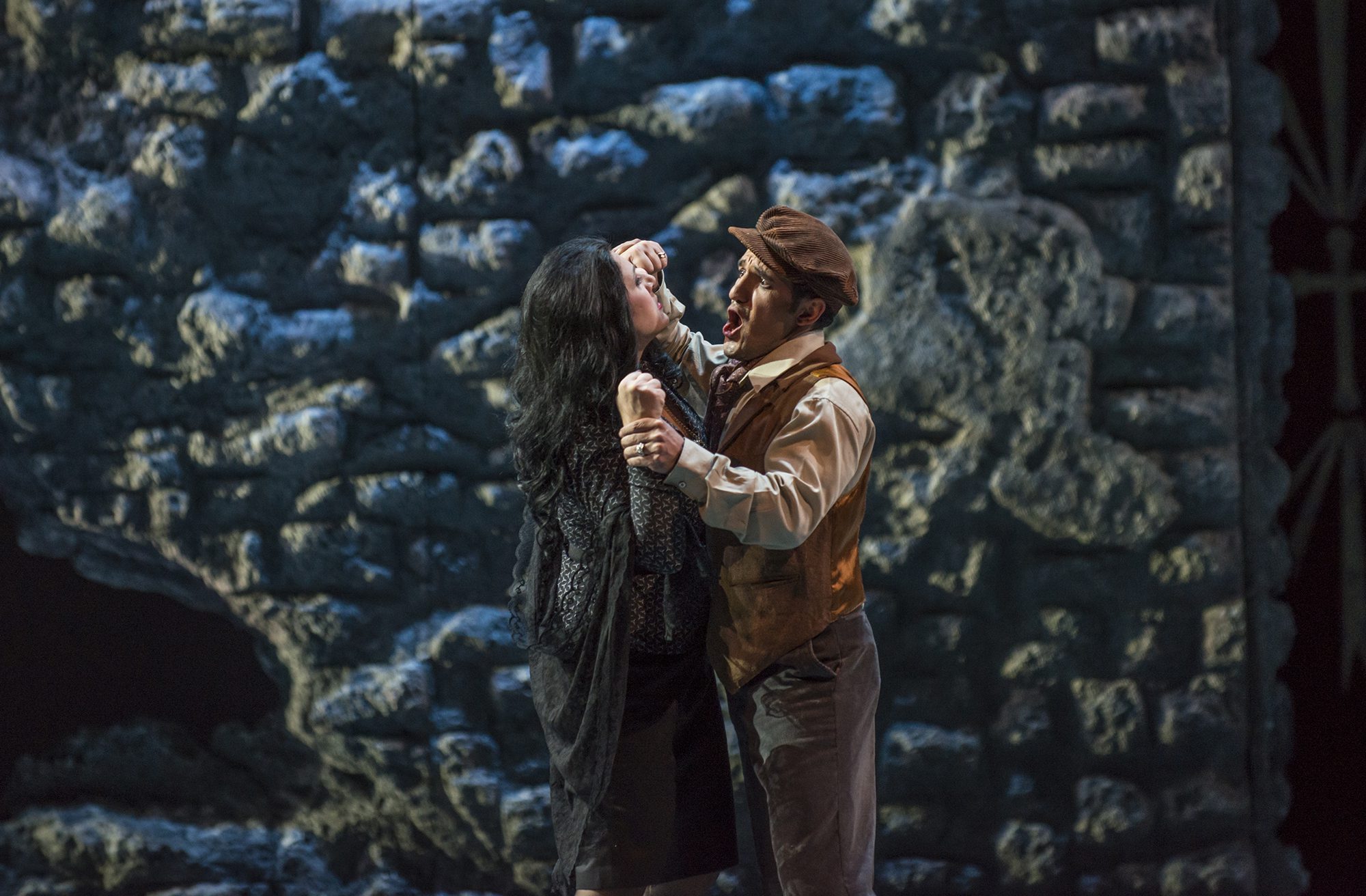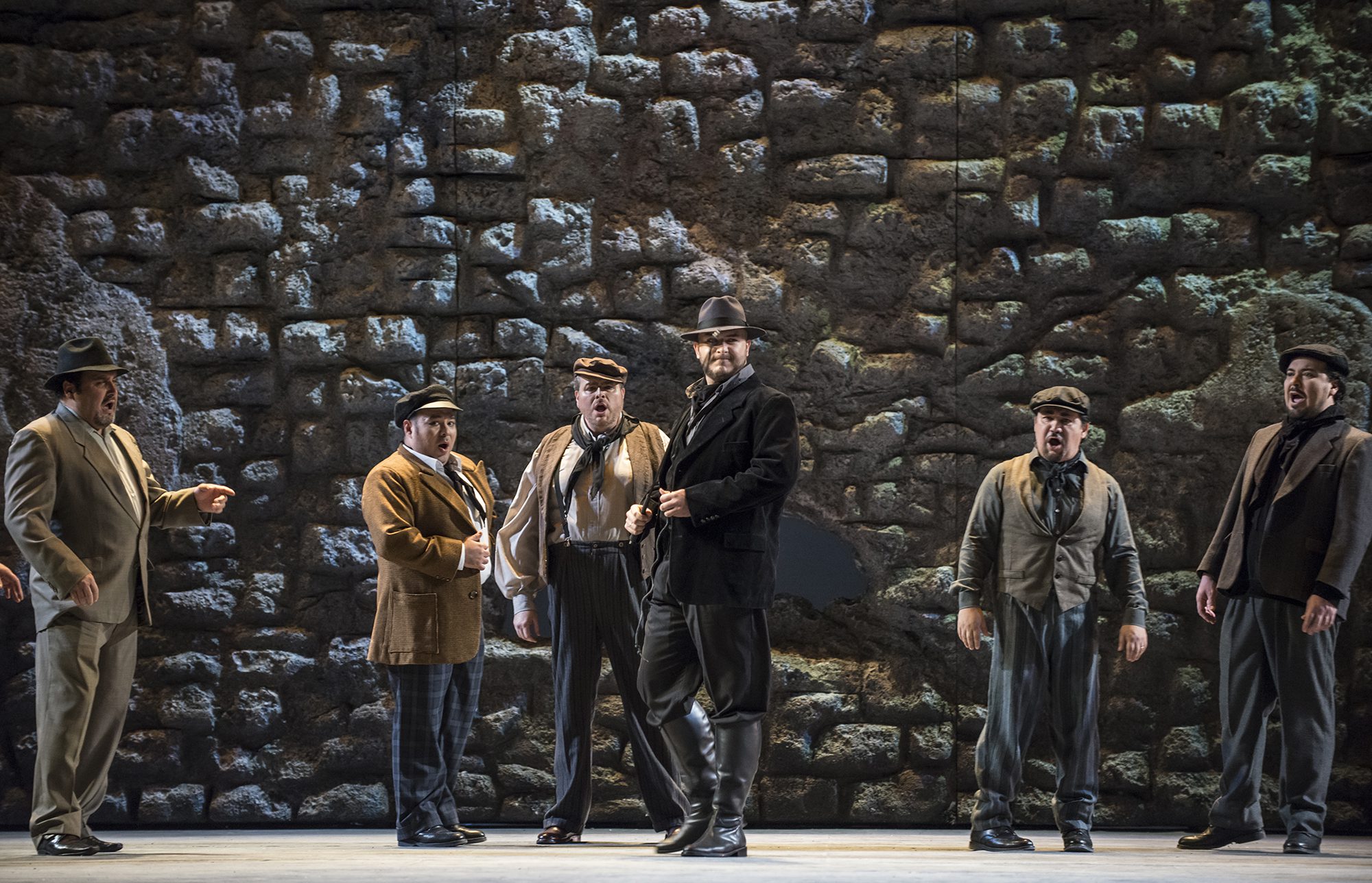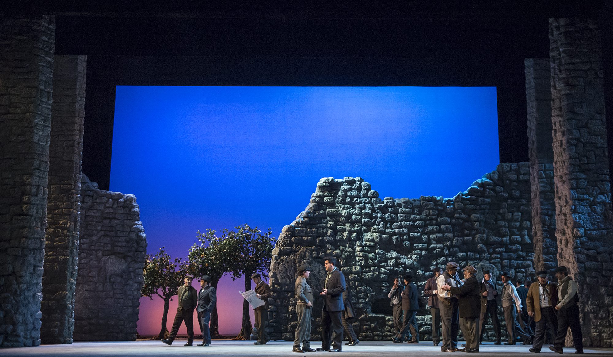 La escenografía de Giorgio Ricchelli, para Cavalleria Rusticana, apabulla con el omnipresente muro del fondo, pero cuenta con un detalle interesante de movimiento, al abrirse para convertirse en la entrada a la iglesia; en ese ambiente la iluminación de Ramón López enfatiza cambios lumínicos para cada situación dramática, sin importar la hora del día, algo que en verdad, agiliza la acción, pero, en demasiadas ocasiones abusa de lo oscuro, lo que sumado al negro o neutro de los trajes femeninos y masculinos, resulta un tanto agobiante.