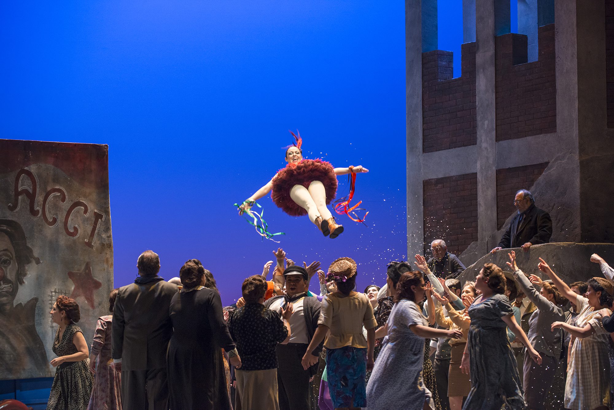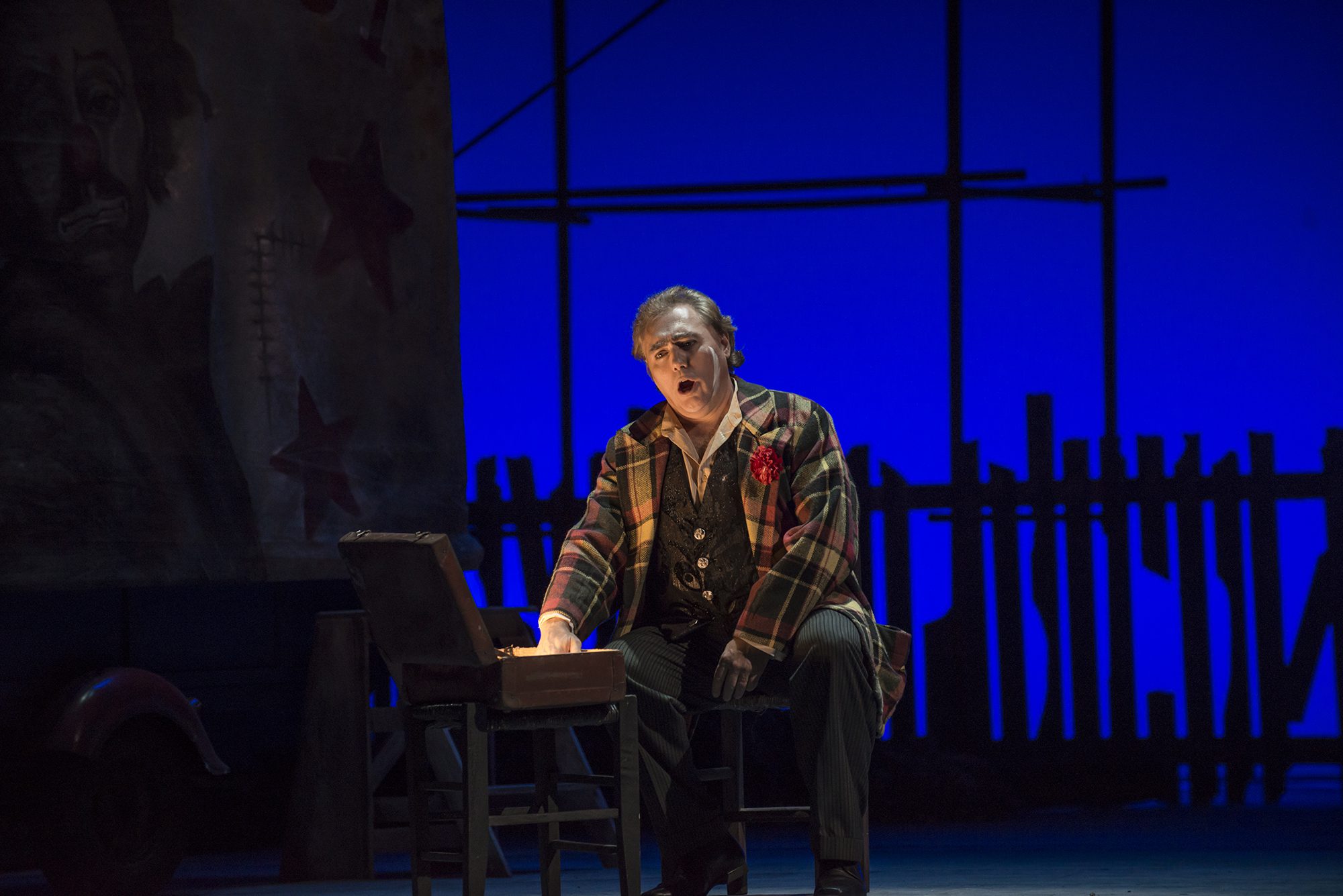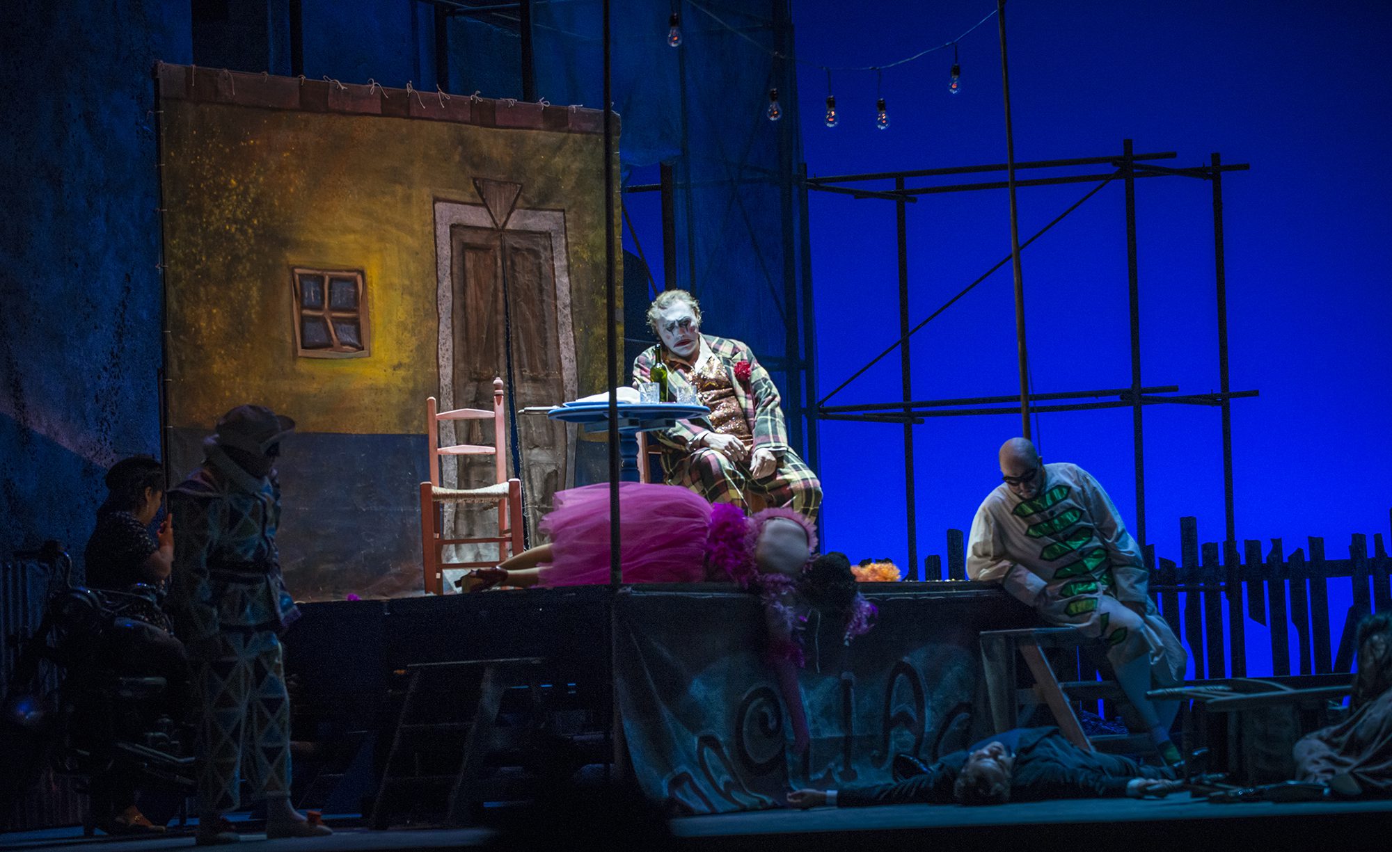 Pagliacci de Leoncavallo, al parecer, se plateó considerando su argumento sórdido y oscuro, por ello, la escenografía (G. Ricchelli) es descolorida, con un insólito edificio de apartamentos, al parecer para enanos, y otro en construcción más atrás; al fondo, la silueta de una vivienda de emergencia, y unos andamios al frente (mirada al neorrealismo italiano?), en ese espacio se desarrolla con una dirección de escena más interesante, apoyada con un grupo de saltimbanquis, mientras que, el escenario ambulante, es muy eficaz.