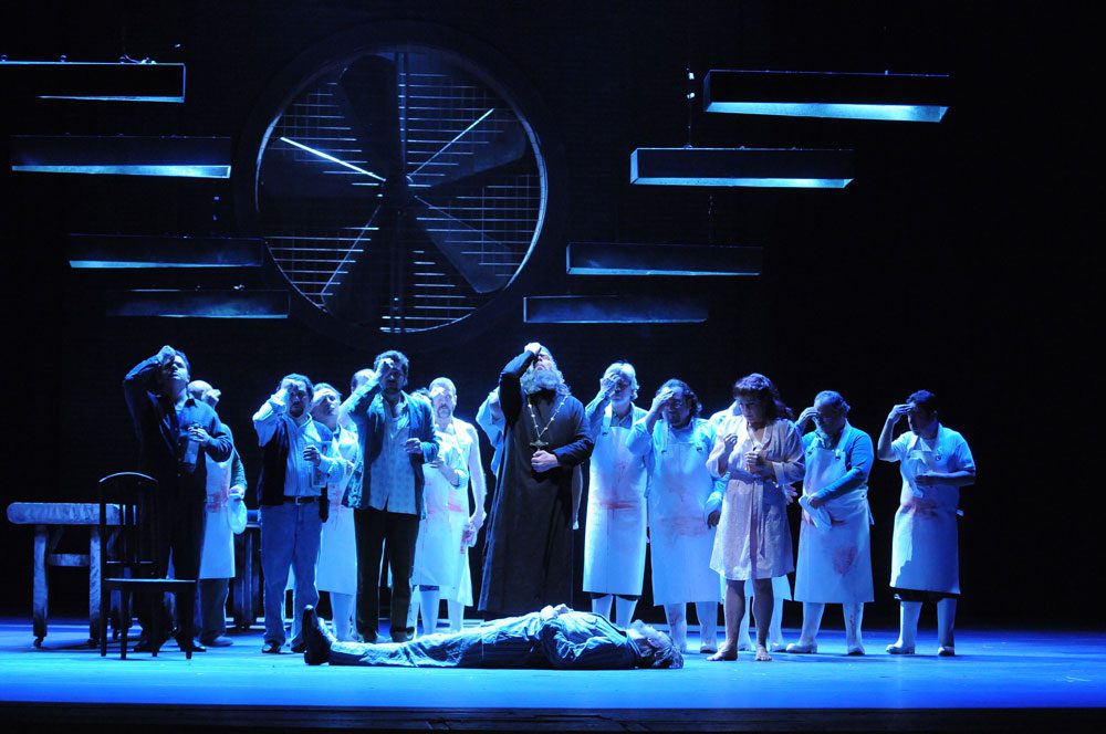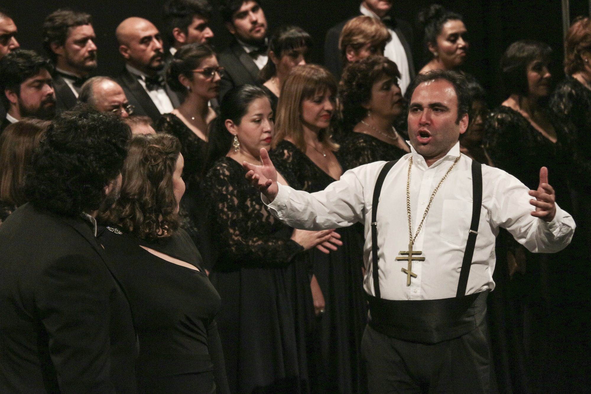 El caso es que a poco andar, la escenografía y vestuario dejaron de ser fundamentales, cobrando primera importancia la sensacional música de Shostakovich, que se pudo apreciar plenamente en toda su magnitud, en este caso dirigida estupendamente por Pedro Pablo Prudencio, que con segura batuta llevó a la Filarmónica de Santiago por los habituales caminos de excelencia, él manejó tensiones y progresiones en un continuo que no dio tregua al público, con contrastes dinámicos certeros, consiguiendo del grupo el mejor sonido posible. Del mismo modo su trabajo en la concertación de solistas y coro, solo puede ser catalogado de notable.