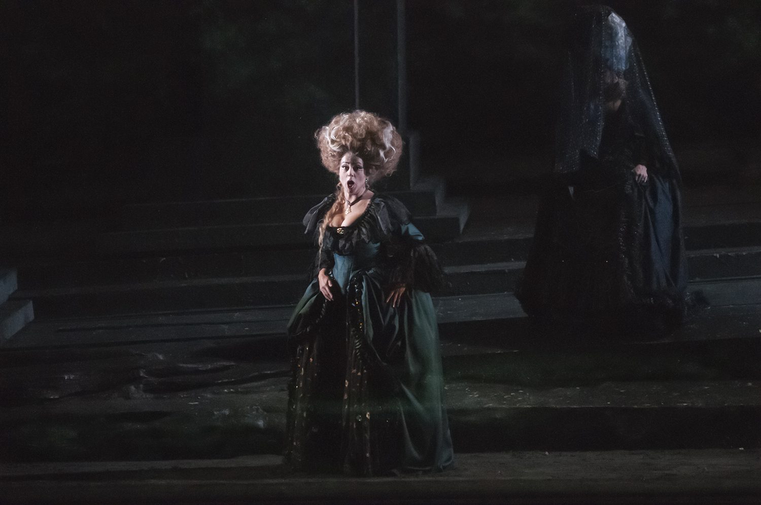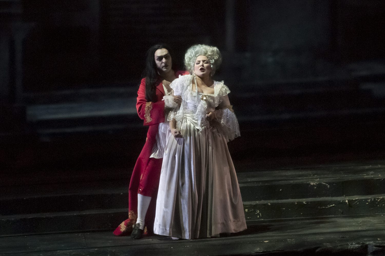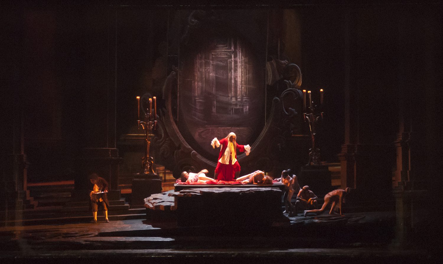 El problema está en que El Comendador, figura central en el clímax no aparece, solo se escucha su voz (demasiado débil, por la ubicación que le fijó la régie), en cambio sí aparece en un enorme espejo el reflejo de Don Giovanni, que ahora está vestido muy similar a Rasputín, con pelo largo y canoso; salvo que se sabe que los vampiros no reflejan su imágen.