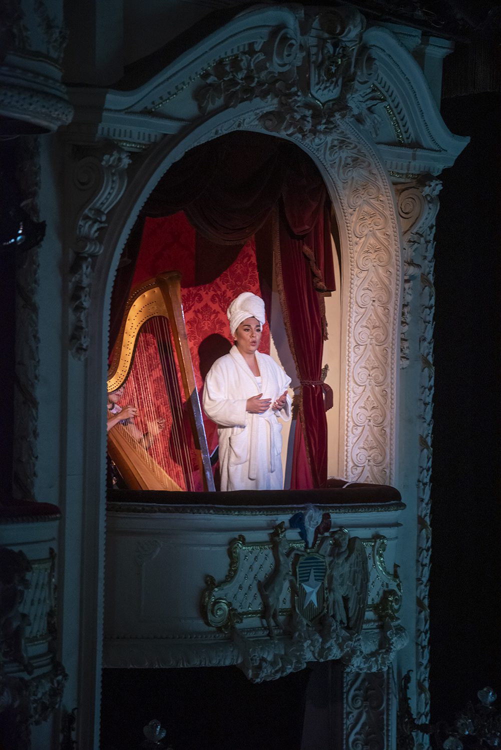 Corinna (Annya Pinto), cantando el aria con arpa, del primer acto. foto Patricio Melo