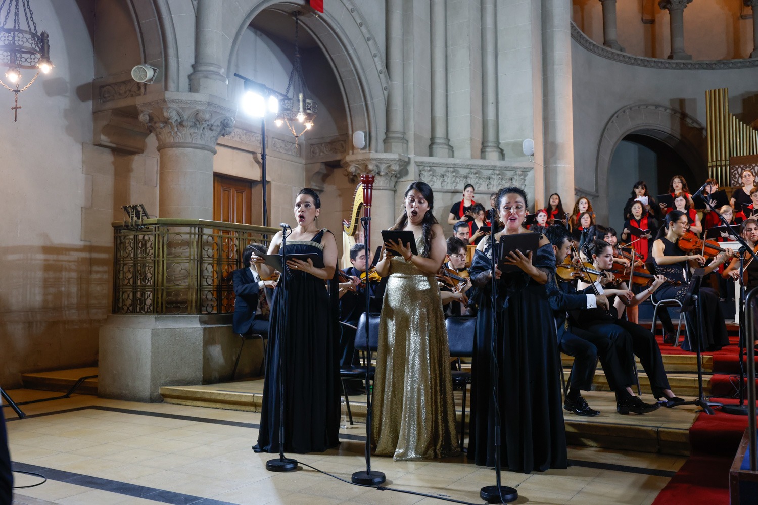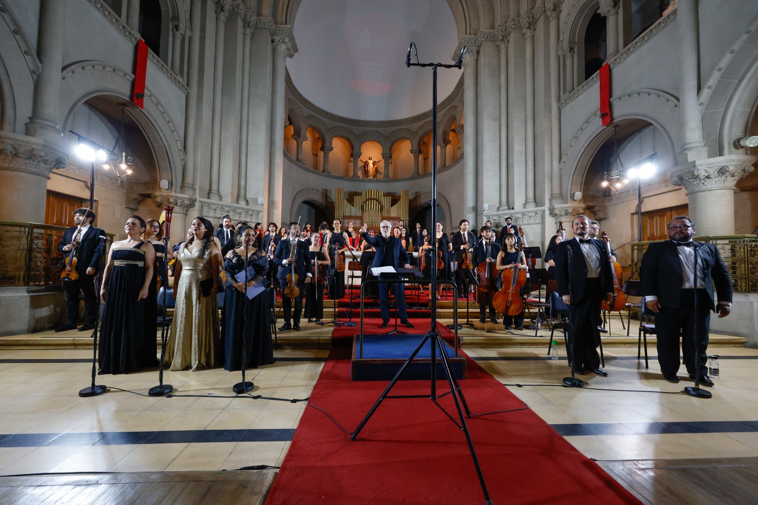 Evelyn Ramírez, Javiera Barrios, Claudia Pereira, Mika Eichenholz, Iván Rodríguez y Cristián Lorca, atrás la Orquesta de Cámara y el Coro de Cámara UC. foto imuc