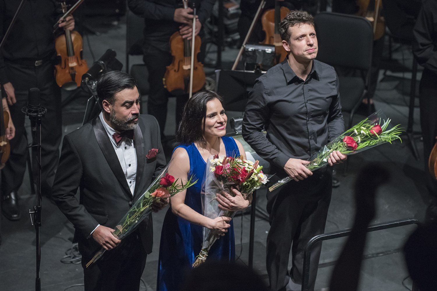 Evelyn Ramírez y Javier Weibel asumieron los roles solistas, por supuesto de memoria ya que deben actuar insertos en las imágenes de la puesta, cantaron detrás de la orquesta y del telón donde se proyectan las imágenes, por lo tanto elevados sobre la orquesta.