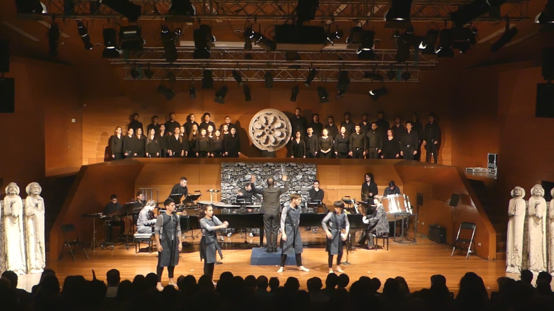 La versión contó con la participación de un Cuarteto de Bailarines, Melisa Maturana, Paulina Vielma, Andrés Millalonco y Rodrigo Sepúlveda, que tuvieron una interesante participación, en una coreografía de Magnus Rasmussen, que utilizó muy bien el escaso espacio que tuvieron, solo al comienzo cuando los bailarines se mezclaron con el Coro, creemos que fue confuso y de poco aporte al desarrollo, pero posteriormente logró la pertinencia necesaria; algo que sin duda no les favoreció fue el vestuario cuyos colores, cerca del azul pizarra, en un diseño atemporal no provocó el contraste necesario.