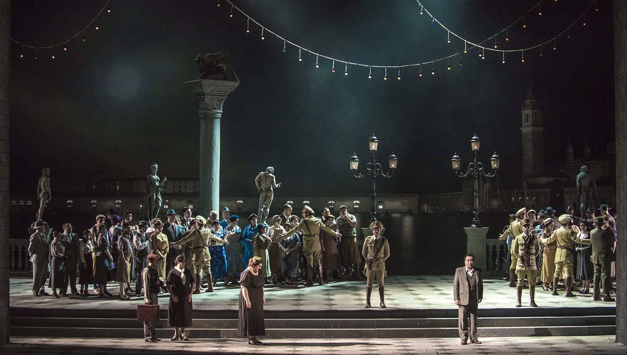 La iluminación de Ricardo Castro tuvo aciertos notables, como en el Gabinete del Dux, siendo tal vez lo mejor aquel de la Sala del Consejo, donde escenografía e iluminación, se combinaron con notable belleza; en lo opuesto, consideramos demasiado plana la escena en la plazoleta junto al Gran Canal, donde no hay relieves ni contrastes, tanto como ocurrió en la escena de la cárcel.