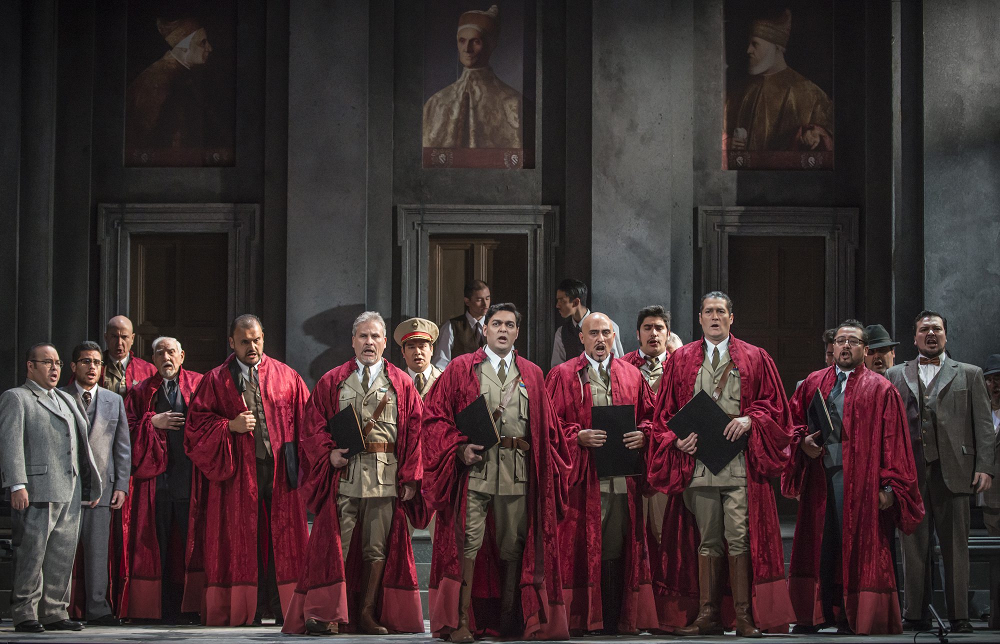 En el caso de los varones, llama la atención la mezcla de ternos con ornamentos propios del tiempo, en que originalmente se ubica la ópera.