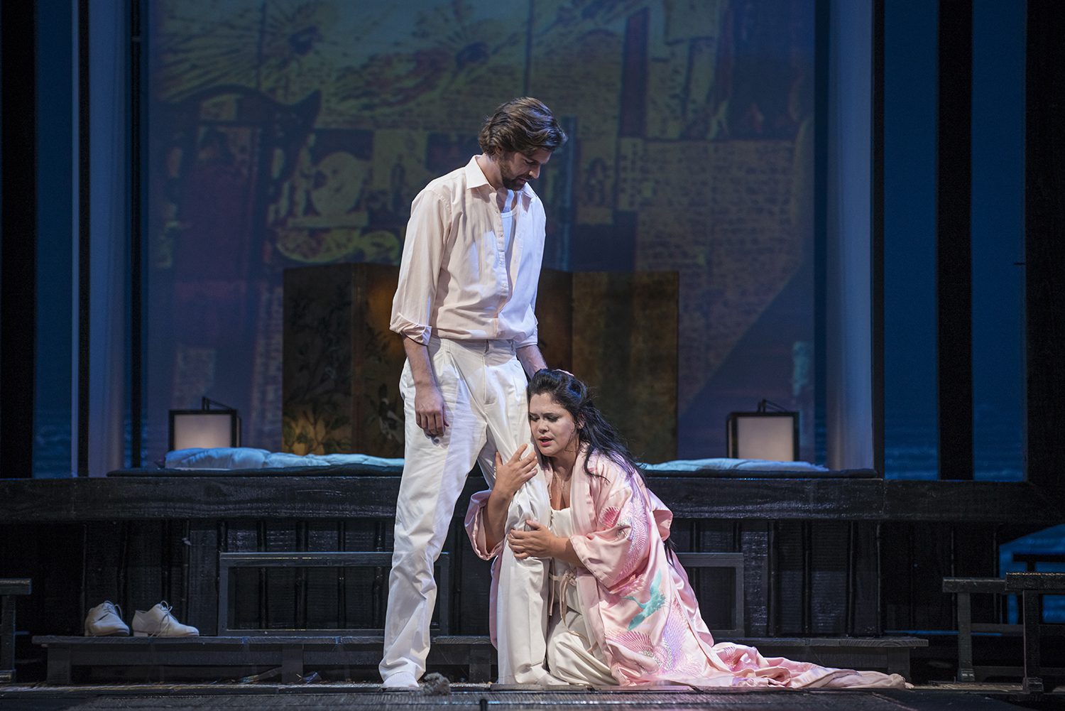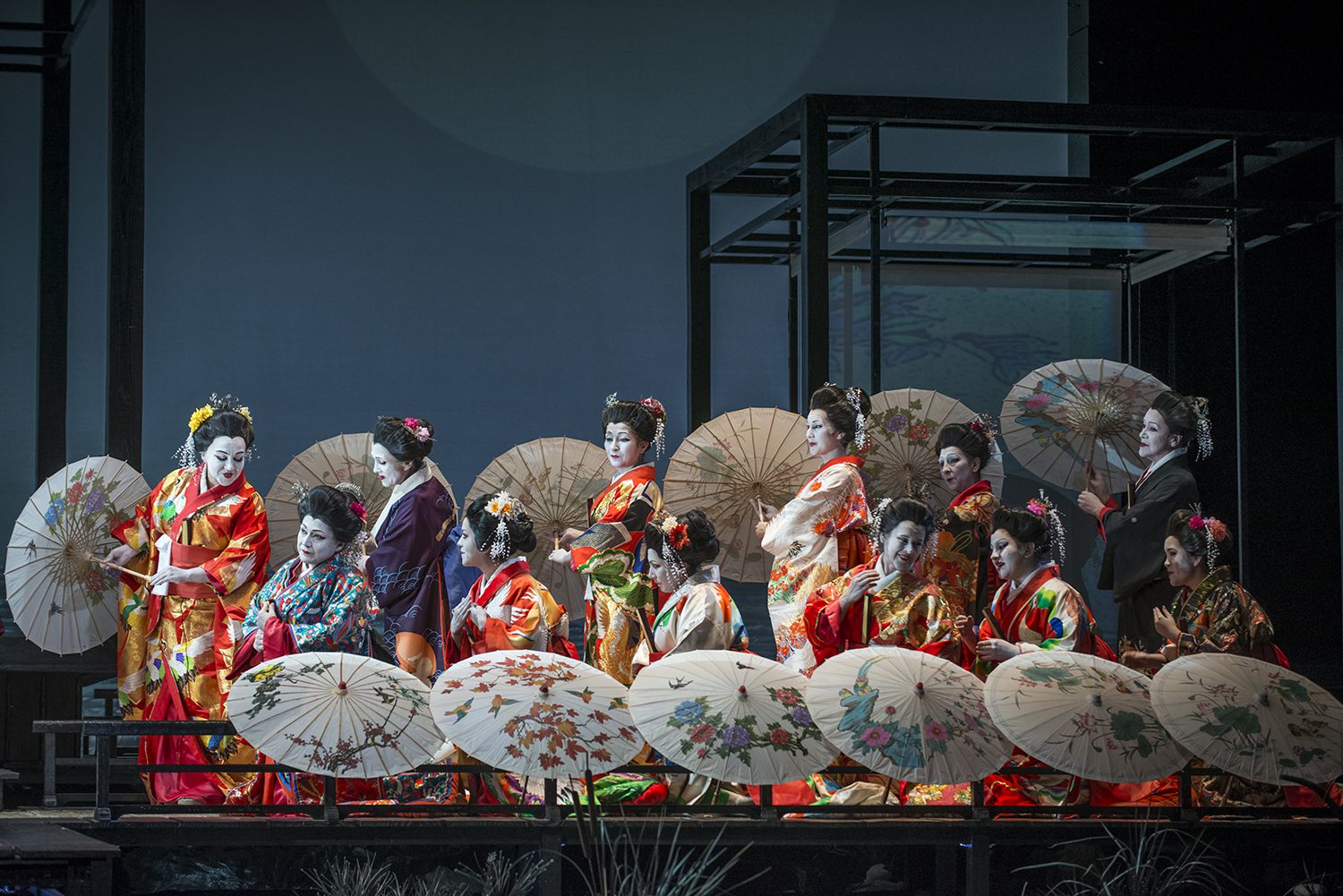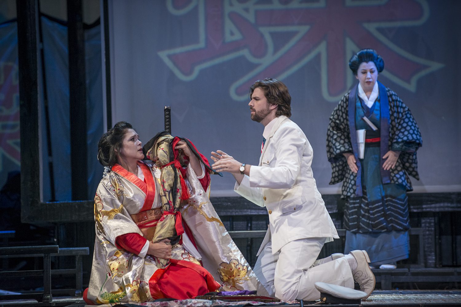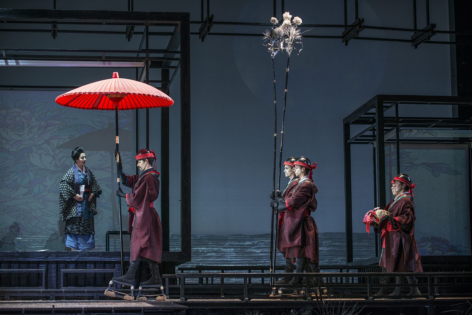 El bellísimo vestuario, enfatiza algunos roles, como el del noble Yamadori, y sus sirvientes, tanto como el cortejo nupcial; la aparición de demonios propios del teatro Kabuki, sugiriendo al tío Bonzo, apareciendo luego, en la representación del mundo onírico de Butterfly, en la noche previa a la anhelada llegada de su marido, junto a una sucesión de imágenes que le provocan el inminente encuentro.