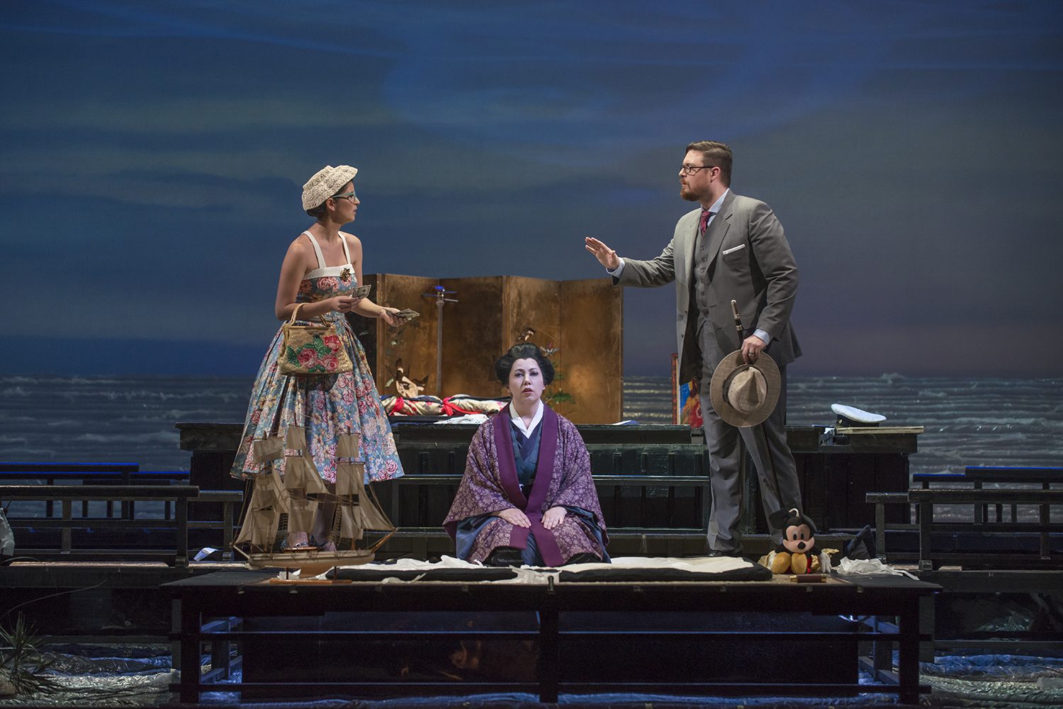 Su planteamiento enfatiza profundamente, el evidente desprecio que sentían los estadounidenses -salvo el Cónsul-, por la cultura y tradiciones japonesas, contribuyendo en ello, la presencia del asistente de Pinkerton, y otros marineros, quienes juegan béisbol, o vacían los tazones de sake, para cambiarlo por whisky, o bien cuando Kate, trata de “comprar” a Suzuki, para que ayuda a contener a Butterfly, cuando deba entregar su hijo, a ella y Pinkerton.