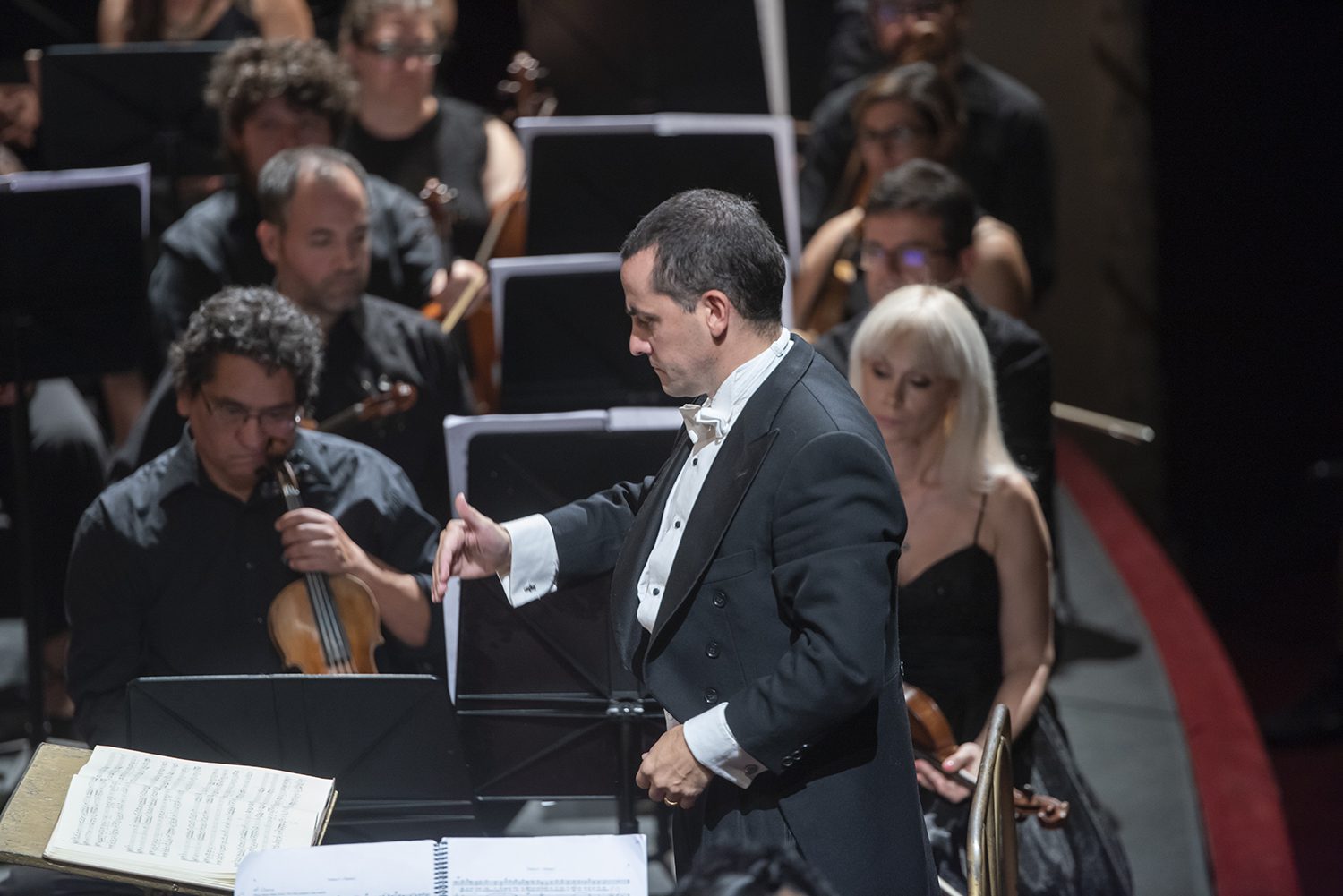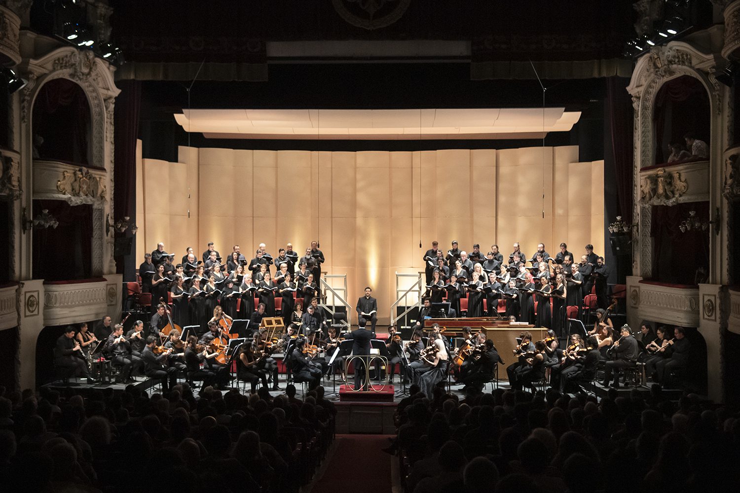 Un inspirado Pedro Pablo Prudencio dirigió a la Filarmónica de Santiago, dividida en dos orquestas de cámara, el Coro del Teatro Municipal, también dividido, al coro de niños y a los numerosos solistas.