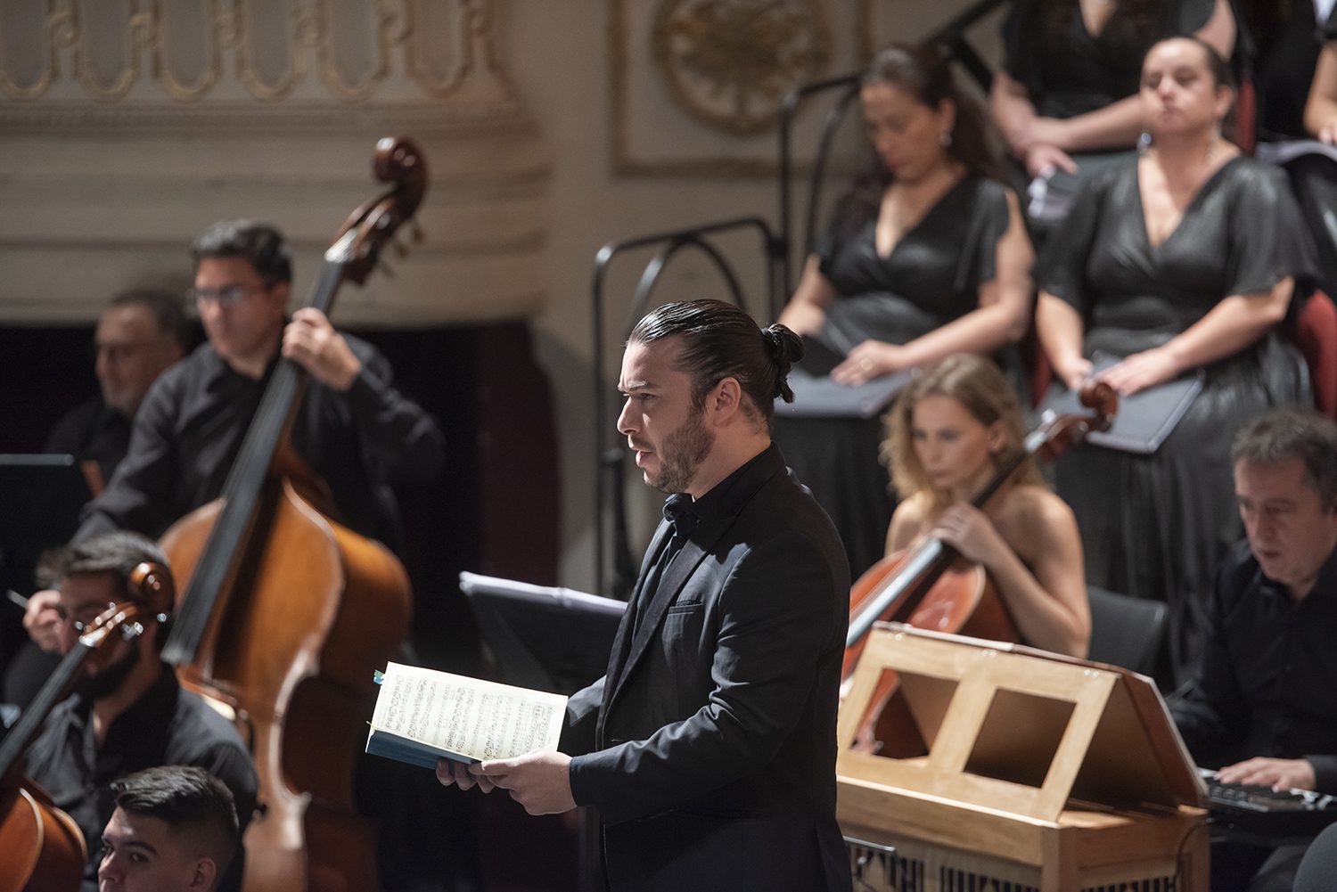 Dijimos que la Filarmónica se dividió en dos orquestas de cámara, logrando ambas un desempeño digno de todo elogio, señalemos que los primeros atriles asumieron los solos instrumentales que son tan desafiantes como como solos de concierto, siempre con sobresalientes resultados; en cuanto al fundamental “continuo” (chelo, clavecín u órgano y a veces contrabajo), que acompaña los recitativos, su desempeño lo consideramos sobresaliente, dando el sustento justo tanto al Evangelista, como a los otros personajes del relato. No podemos dejar de mencionar a Florencia Bardavid, la solista en viola da gamba, que acompañó algunas arias de la segunda parte, en perfecto estilo, fraseos y articulaciones notables, además de bello y poderoso sonido.