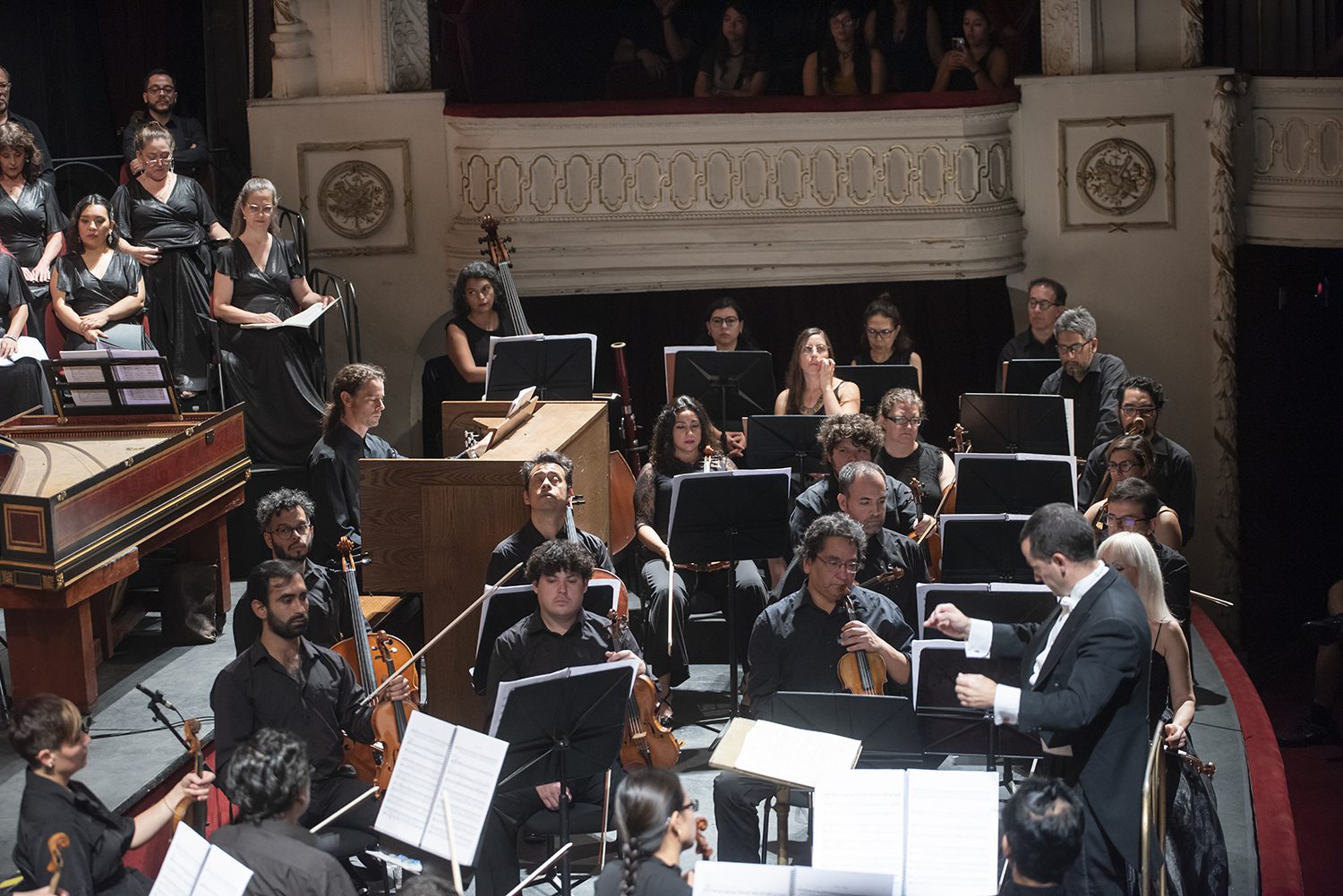 La orquesta y parte del coro Dos, dirigiendo Pedro Pablo Prudencio, foto Patricio Melo