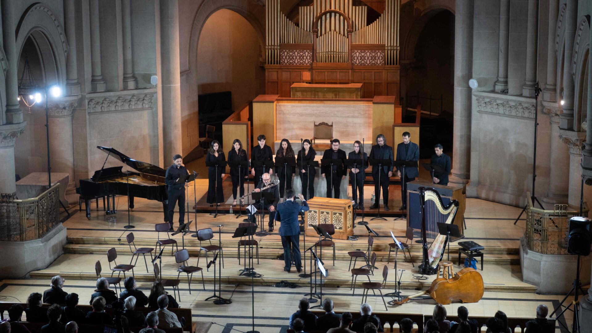 Patricio Sabaté, Guillermo Lavado flauta baja y Octeto vocal interpretando Reimann.
