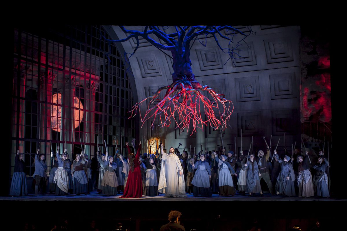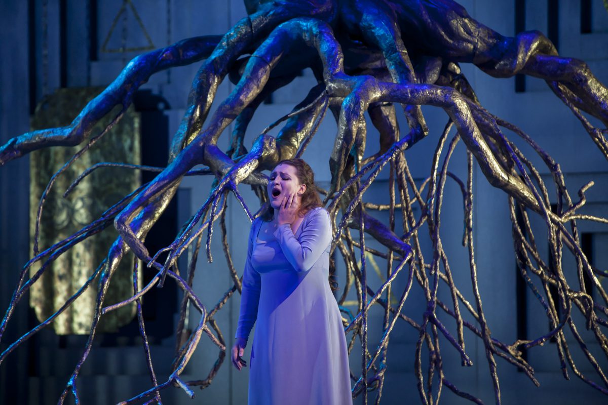 Omnipresente y colgando sobre el centro del escenario, el árbol sagrado que subirá o descenderá según la acción, un quiebre es el sobrio dormitorio de Norma de carácter neoclásico, que tendrá siempre iluminación pareja, al revés de las otras escenas donde la iluminación cambia sutil y permanentemente, creando escenas simplemente mágicas, este juego de iluminación de Marck McCullough es sin duda uno de los factores decisivos en el éxito de la propuesta, en contraste a otras donde a veces se opta por el feísmo como recurso “conceptual”. Mencionaremos la belleza poética del aria Casta Diva, un lujo en refinamiento visual.