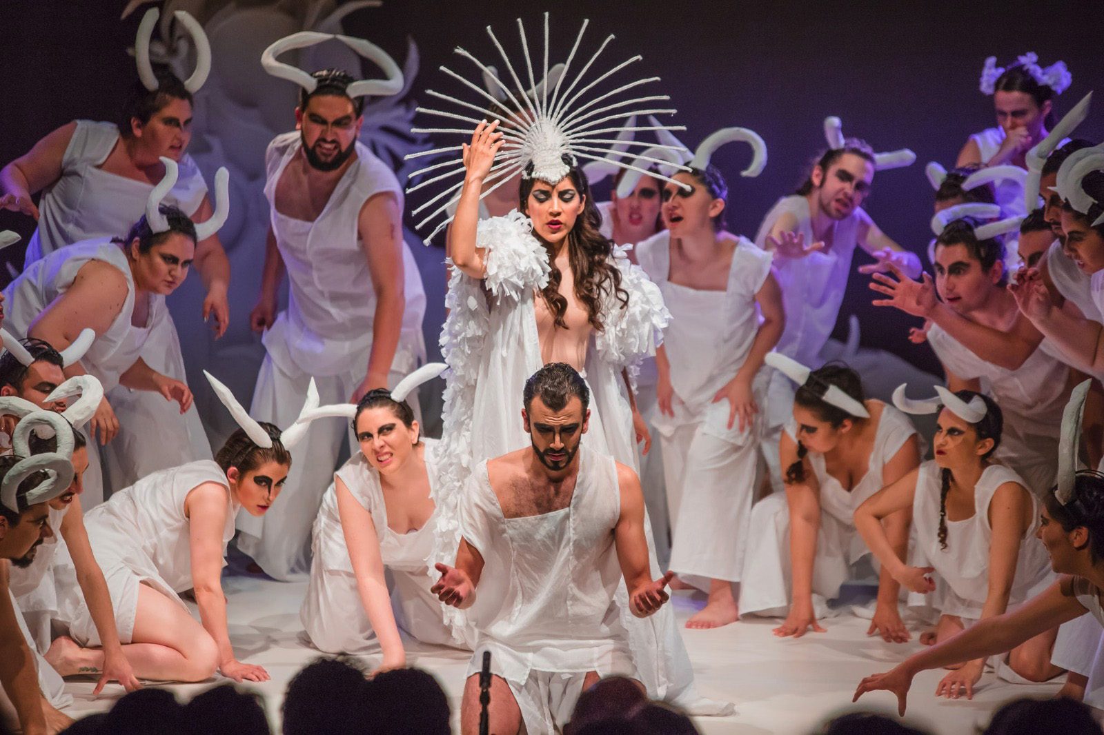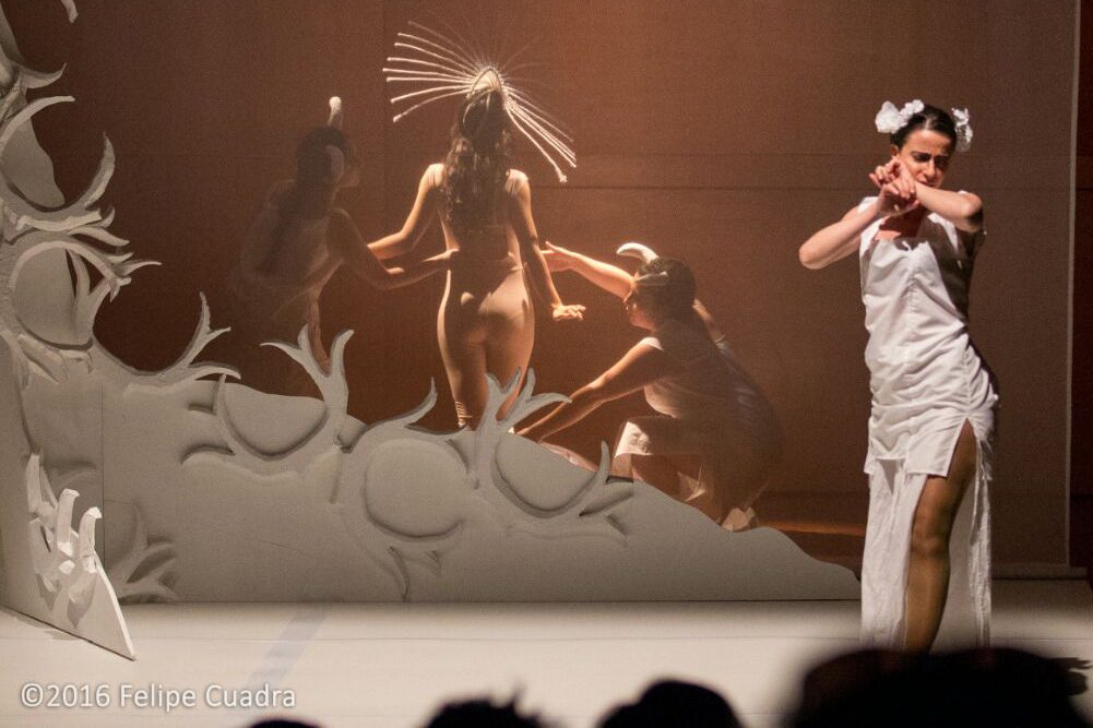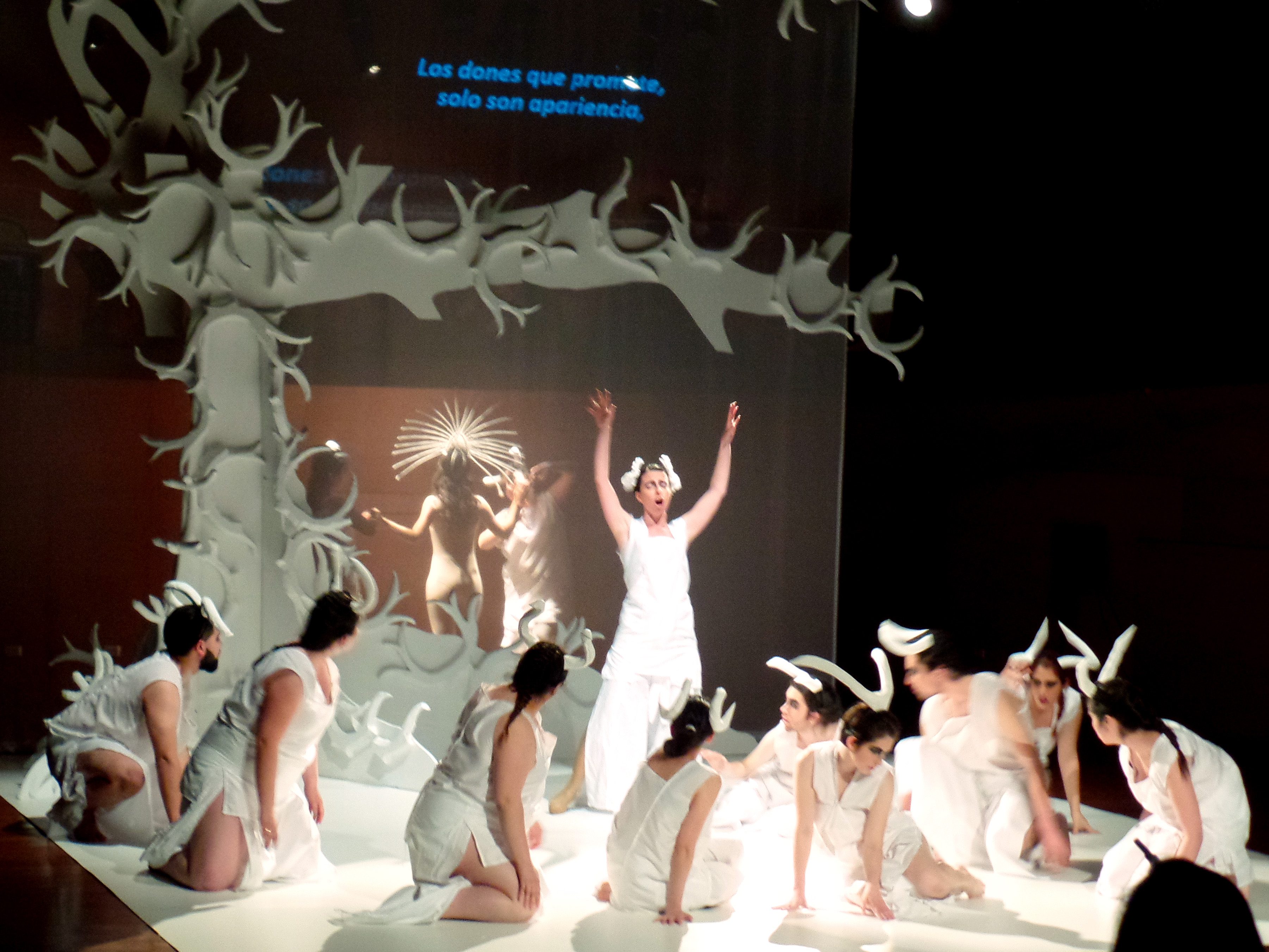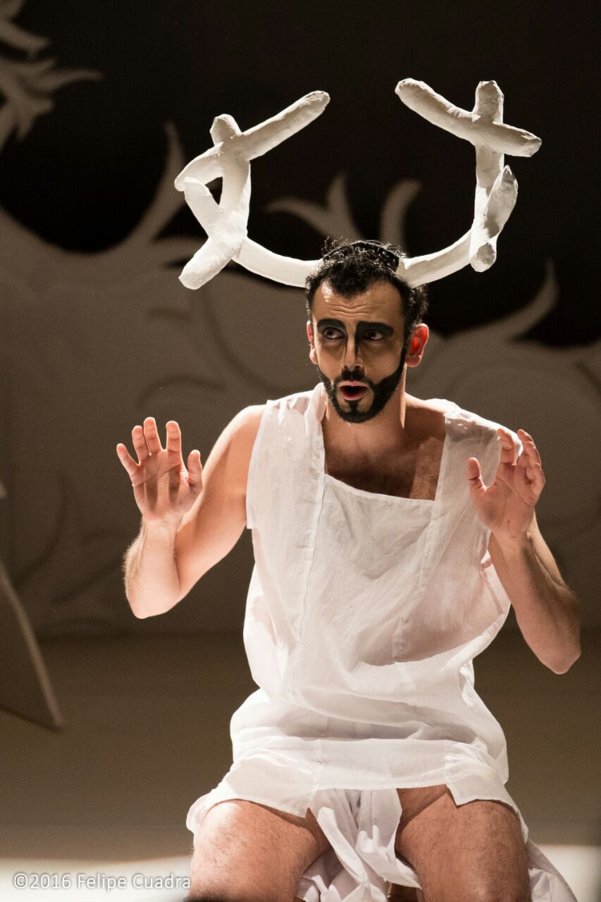 La escenografía contempla sol un árbol blanco que alude a la cornamenta de los ciervos y un gran velo transparente asume el bucólico paraje, donde llegará Actéon a cazar, sin saber que también ha sido el lugar escogido por Diana y su corte de ninfas y faunos, para tomar un baño asistida por dos doncellas, en ese plano se desarrollará la tragedia, pues Actéon, contemplará la belleza desnuda de Diana, y esta furiosa le transformará en ciervo, para luego ser devorado por sus perros.