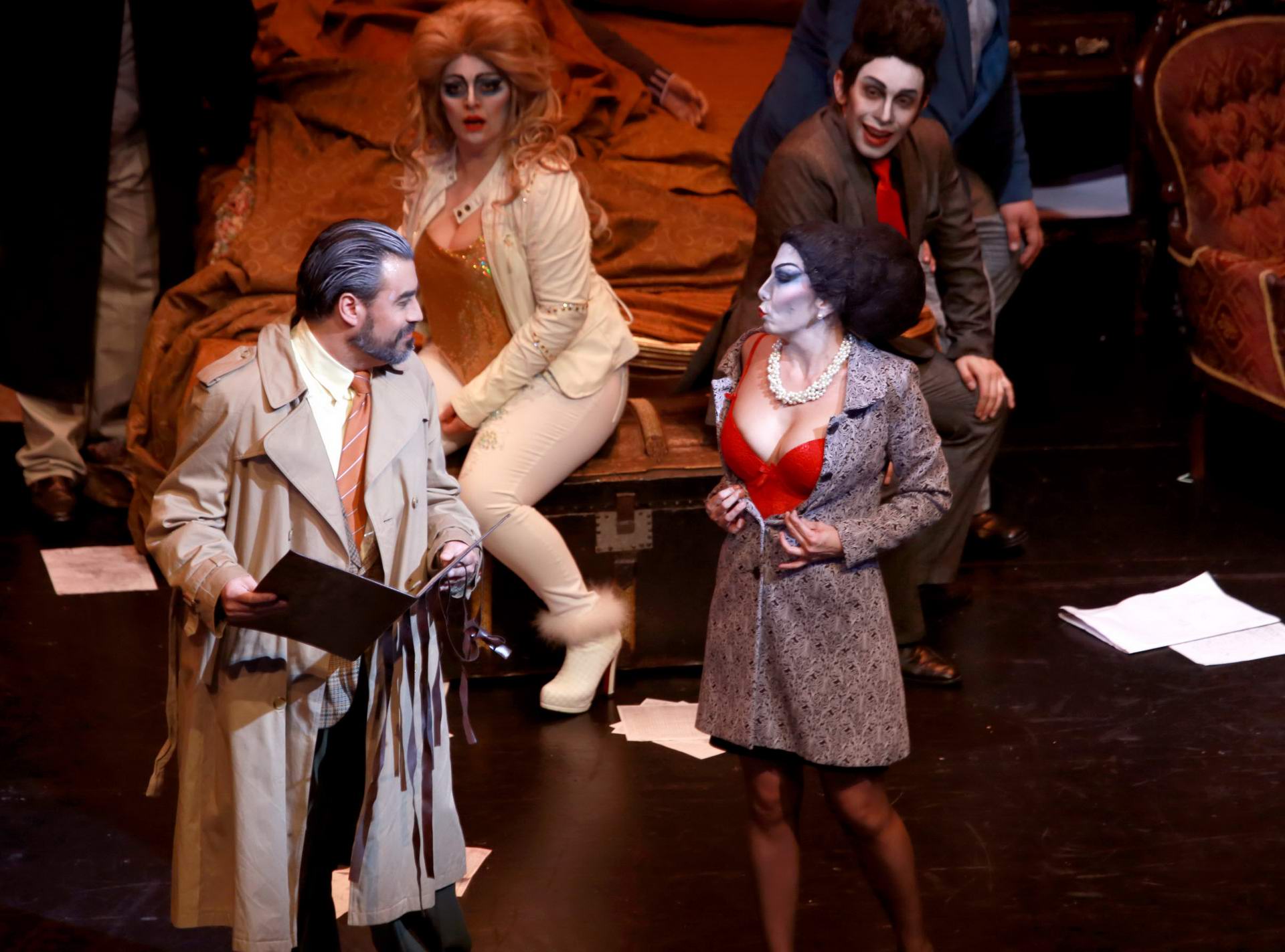 Gianni Schicchi (Javier Weibel) preparando, con el resto de la familia, la suplantación de Donati. foto producción