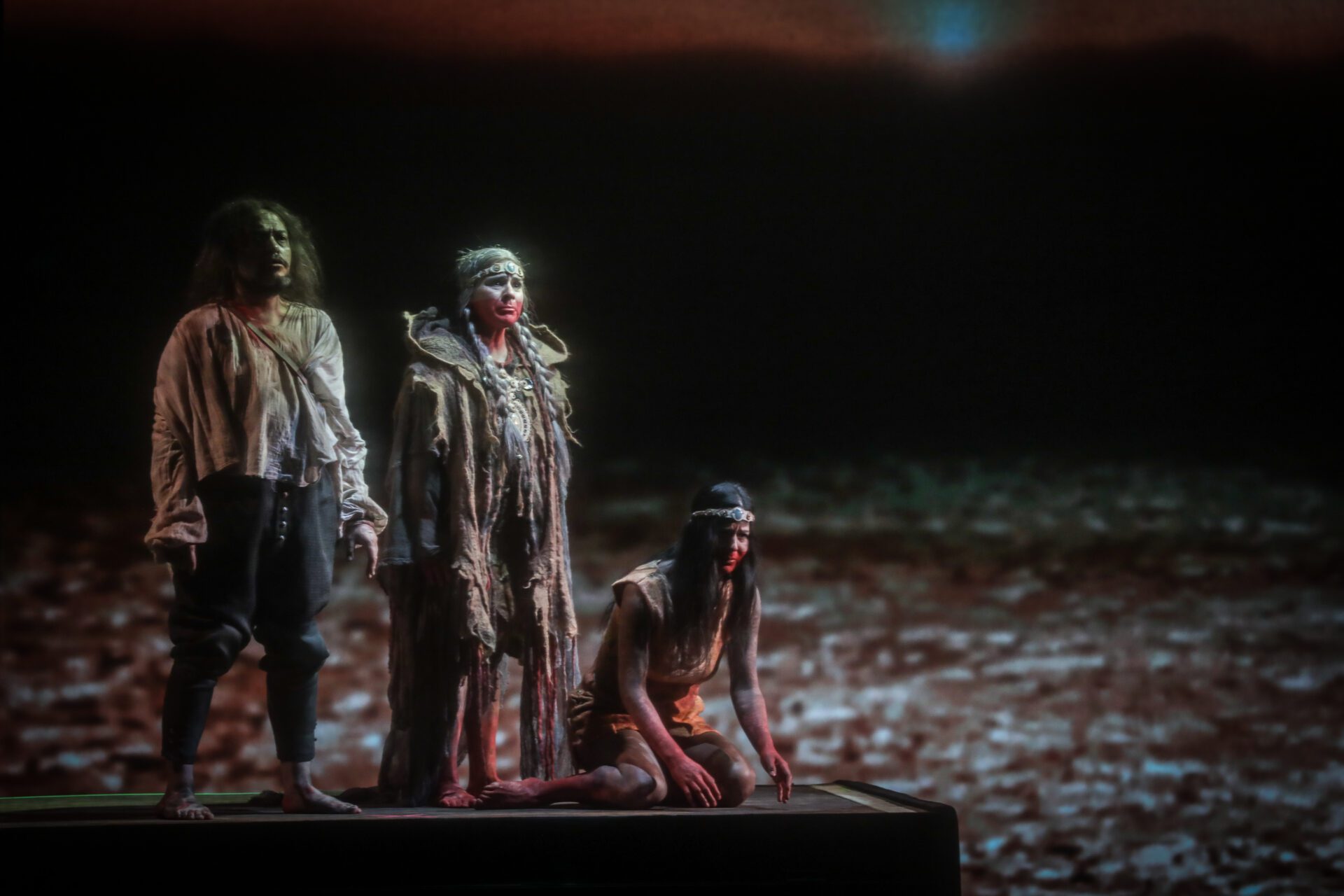 Juan de Cartagena (Sergio Gallardo), Golenkon (Evelyn Ramírez) y Xorenken (Marcela González)
