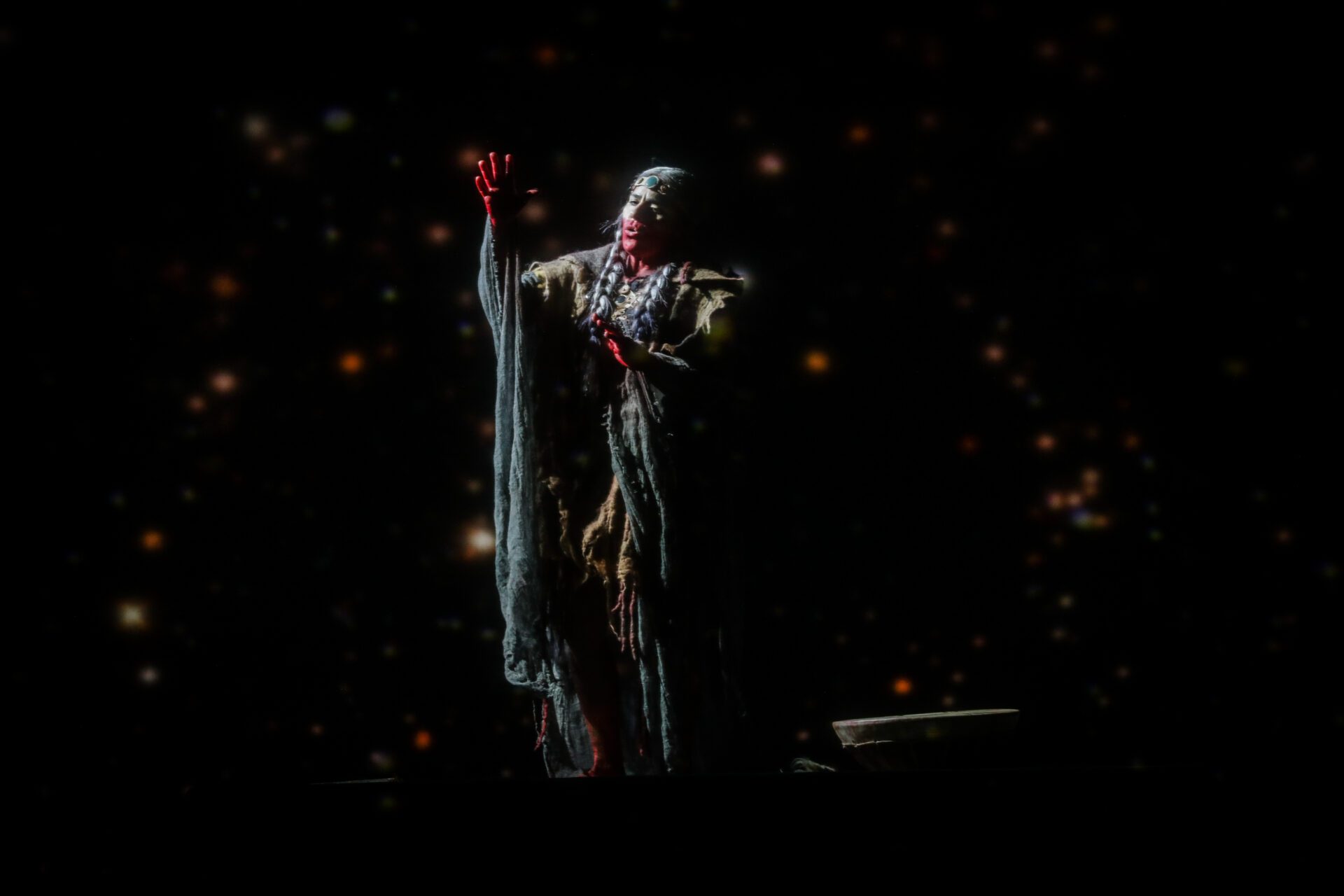 Ikalemen (la actriz María Paz Grandjean) recordando relatos antiguos. foto producción