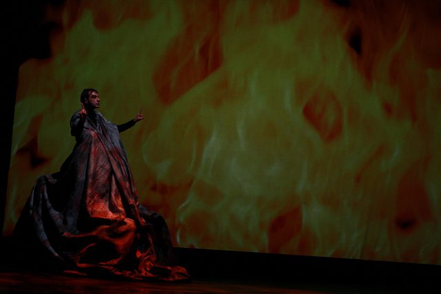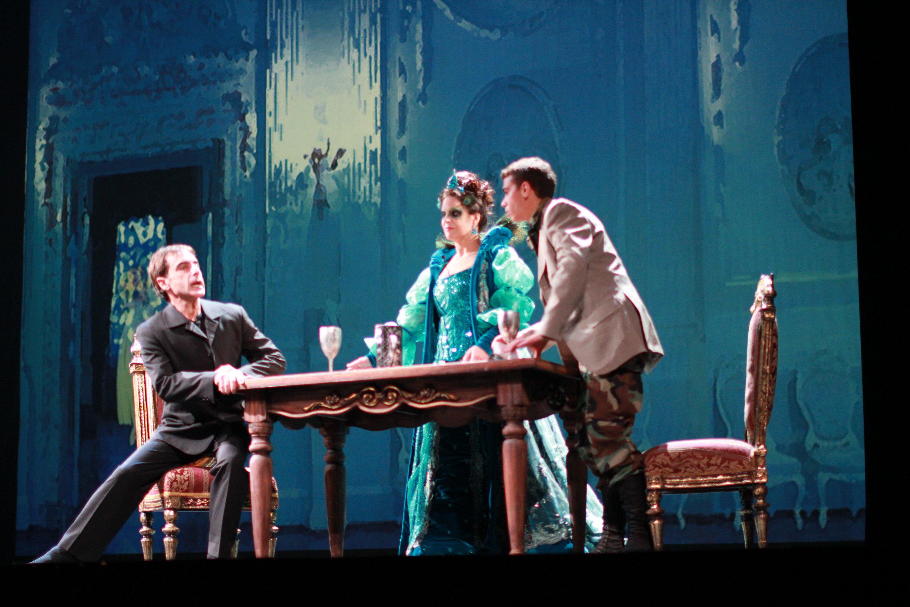 En el caso de la puesta en escena de Miryam Singer (escenografía, vestuario, régie, ideas multimediales), se introducen varias innovaciones, tal vez la más importante, sea que los tres personajes, bailarines o mimos, asuman parte de los textos del relator, convirtiéndolos en actores dialogantes de la historia.