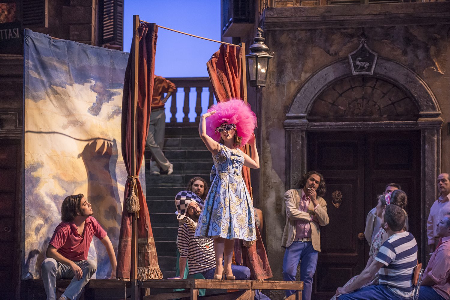 Llegada de Fiorilla (Patricia Cifuentes) en motoneta, vestida de un color diferente a la soprano Internacional, en un acierto de vestuario. foto Patricio Melo