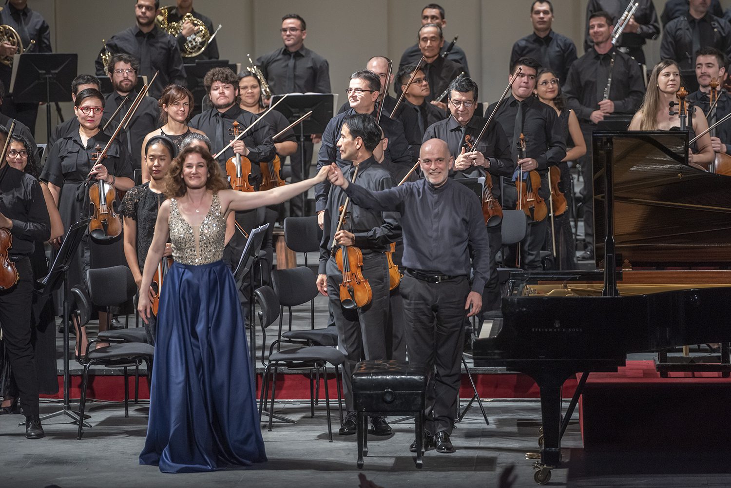 Martina Filjak, Roberto Rizzi Brignoli y la Orquesta Filarmónica, agradecen las ovaciones. foto Patricio Melo