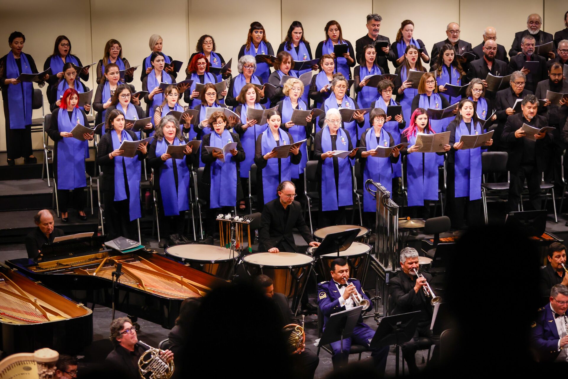 Coro Sinfónico, Camerata Vocal y la Sinfónica y la Banda FACH dirigidos por Rodolfo Saglimbrni durante la interpretación de la Sinfonía de los Salmos de Igor Stravinsky. foto Alejandra Fuenzalida