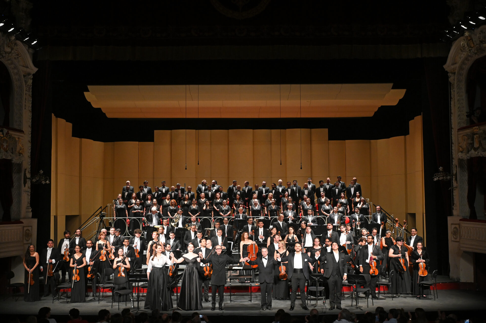 Megan Moore, María Kokareva, Evelino Pidó, Alejandro Reyes,Leonardo Sánchez, Matías Moncada agradecen junto a la Filarmónica de Santiago y el Coro del Municipal las ovaciones del público, foto Juan Millán