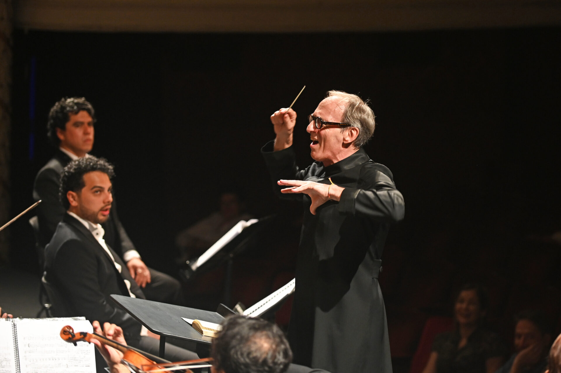 Evelino Pidó dirigiendo Rossini, a la izquierda Matías Moncada y Leonardo Sánchez, foto Juan Millán