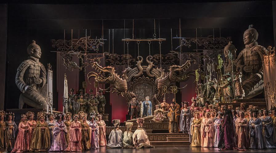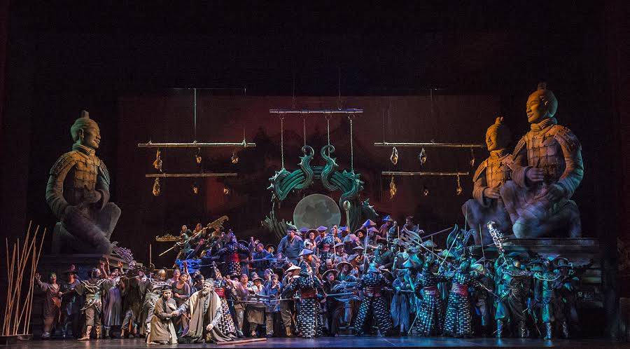 Su diseño fastuoso, aunque sin recargamientos innecesarios, reúne todos los elementos para transportarnos a la China legendaria, donde ocurre el argumento. Destacaremos las tres enormes esculturas, que enmarcan la escenografía, que en su alusión a los guerreros de terracota, demuestran muy bien, el poder omnímodo de los emperadores.