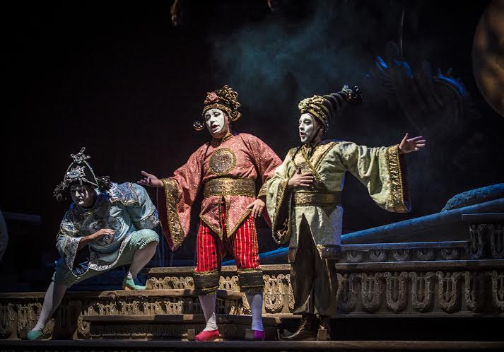 El trío de Ministros; Ping (Patricio Sabaté), Pang (Pedro Espinoza) y Pong (Gonzalo Araya), excelentes en lo vocal y graciosísimos en actuación, debemos señalar, que en varios momentos, no solo deben cantar, también bailar, mostrándose afiatadísimos, mientras que cada uno, desarrolló al máximo su voz y lo actoral, en función del resto.