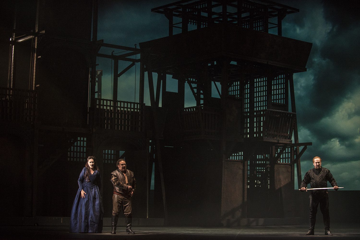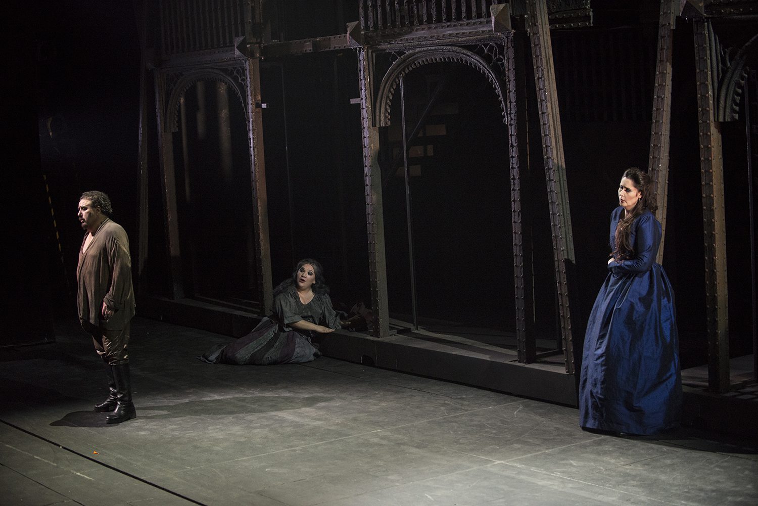 Leonora (Mónica Ferracani) Manrico (José Azocar) y Conde de Luna (Omar Carrión) foto Patricio Melo