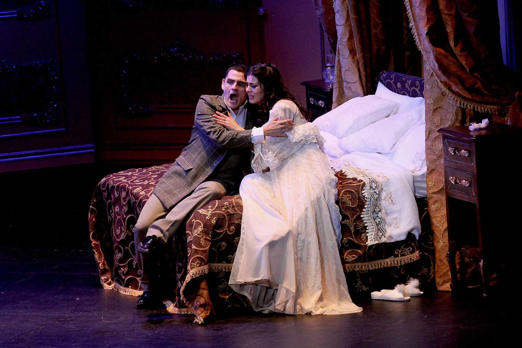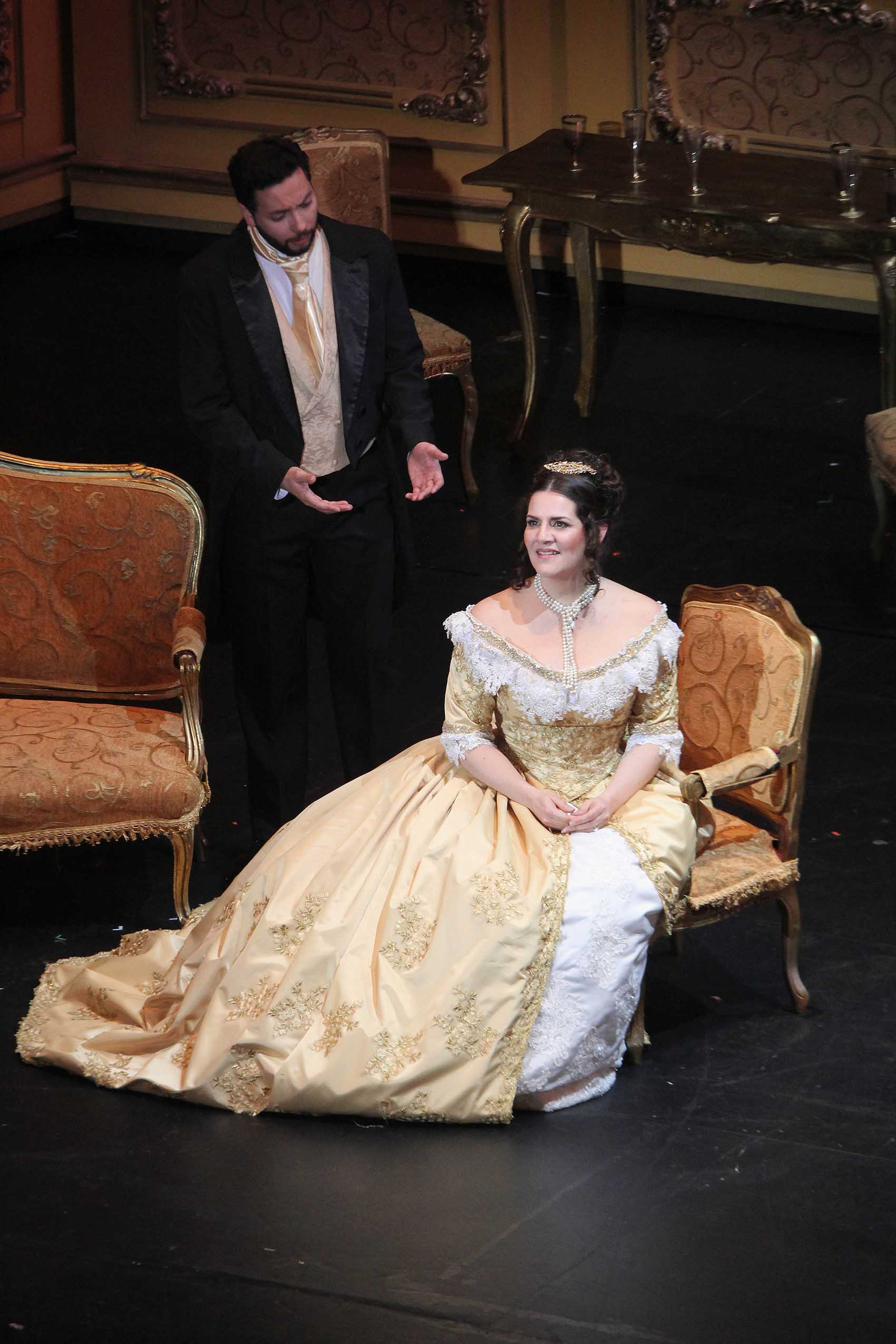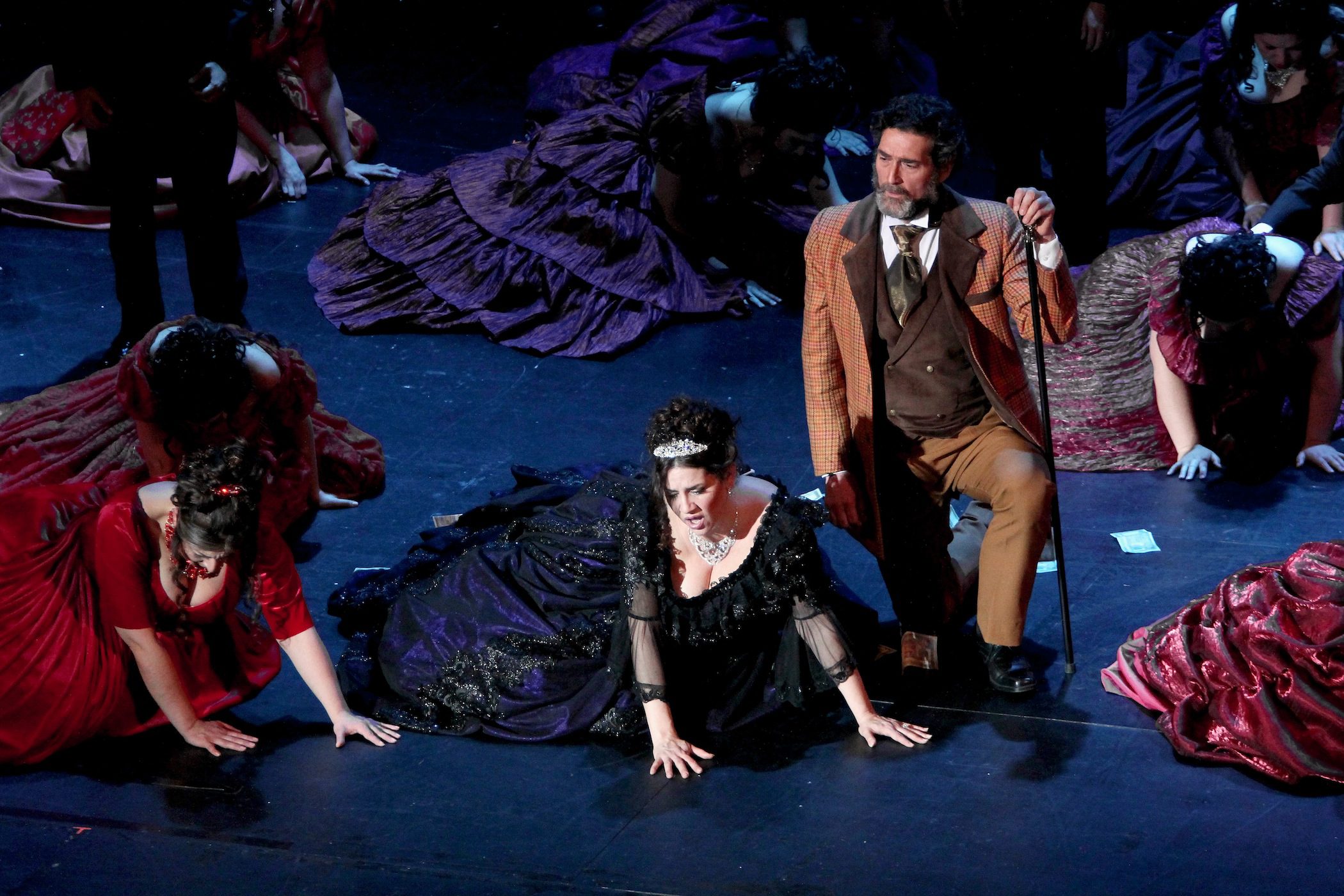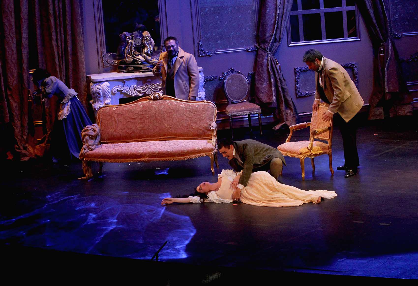 Giorgio Germont (Pablo Oyanedel), padre de Alfredo trata de auxiliar a Violeta (Pamenla Flores) tras ser ofendida. foto TMLC